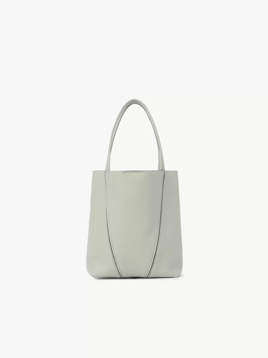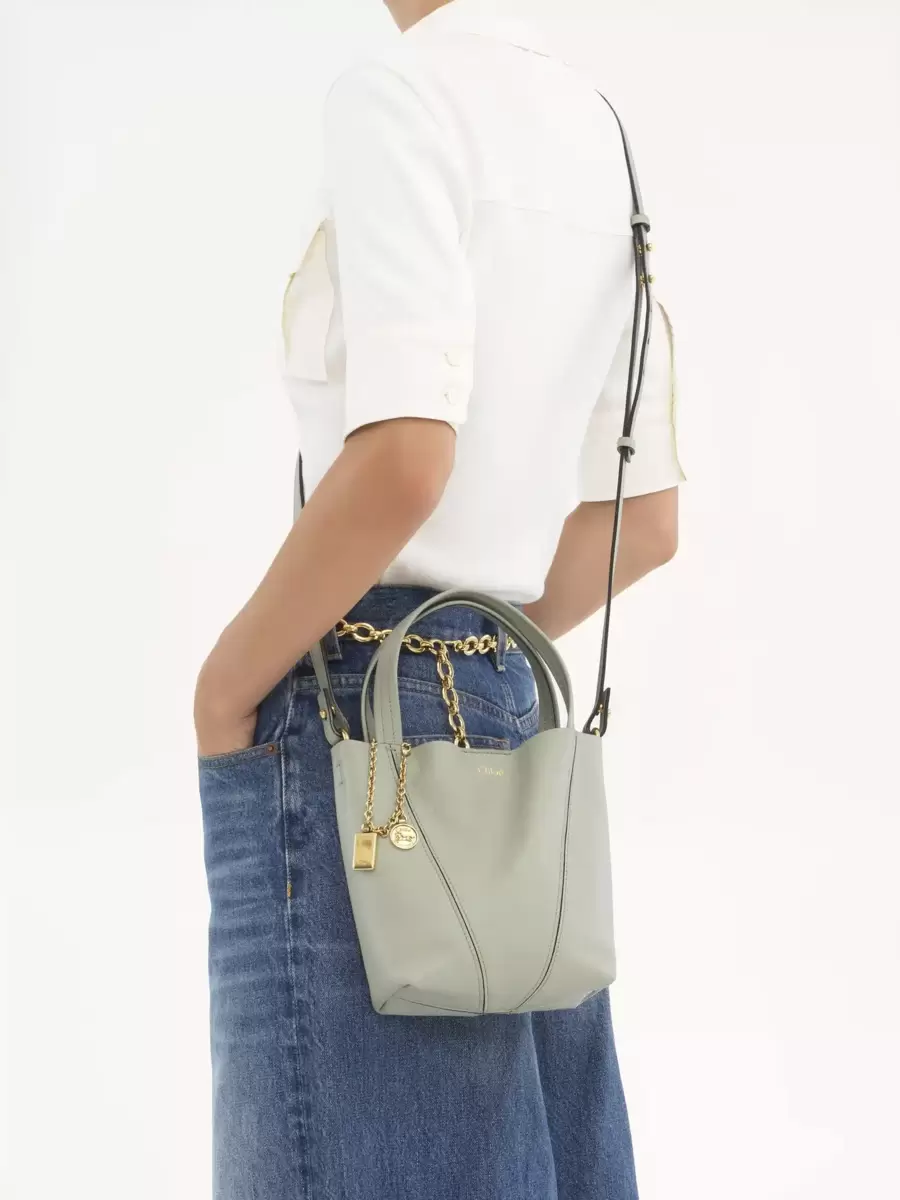 Crafted from shiny grained cowhide, the small Chloé Spin tote bag has a minimalist silhouette elevated with graphic lines. A dangling chain features the Maison’s signature Chloé and Horse Medals.