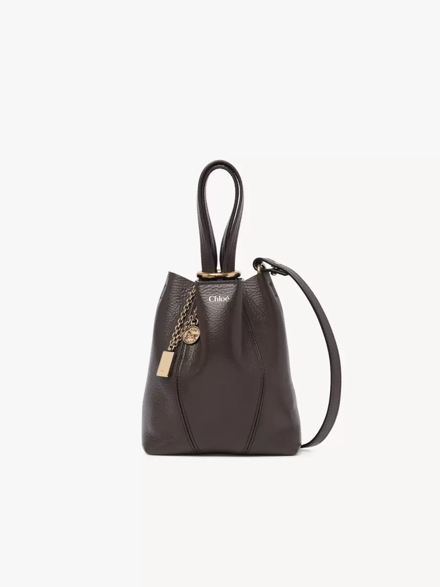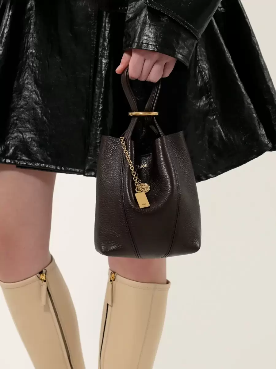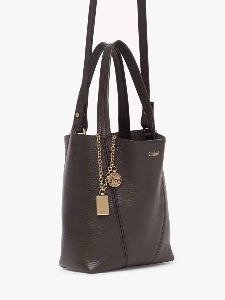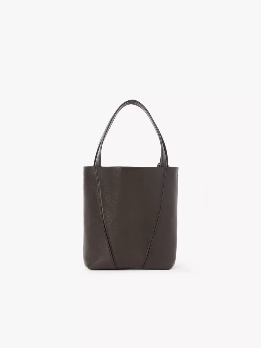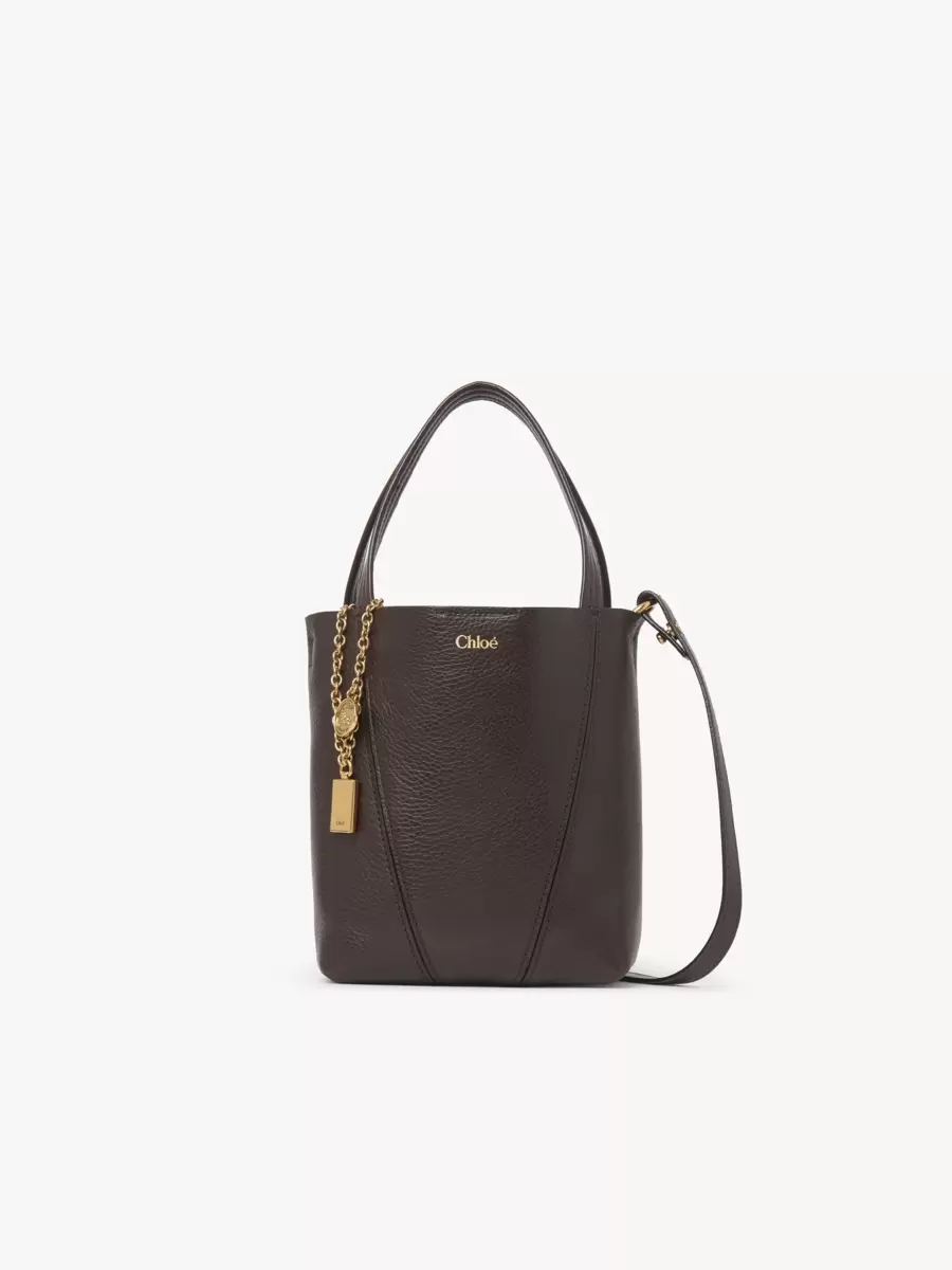 Crafted from shiny grained cowhide, the small Chloé Spin tote bag has a minimalist silhouette elevated with graphic lines. A dangling chain features the Maison’s signature Chloé and Horse Medals.
