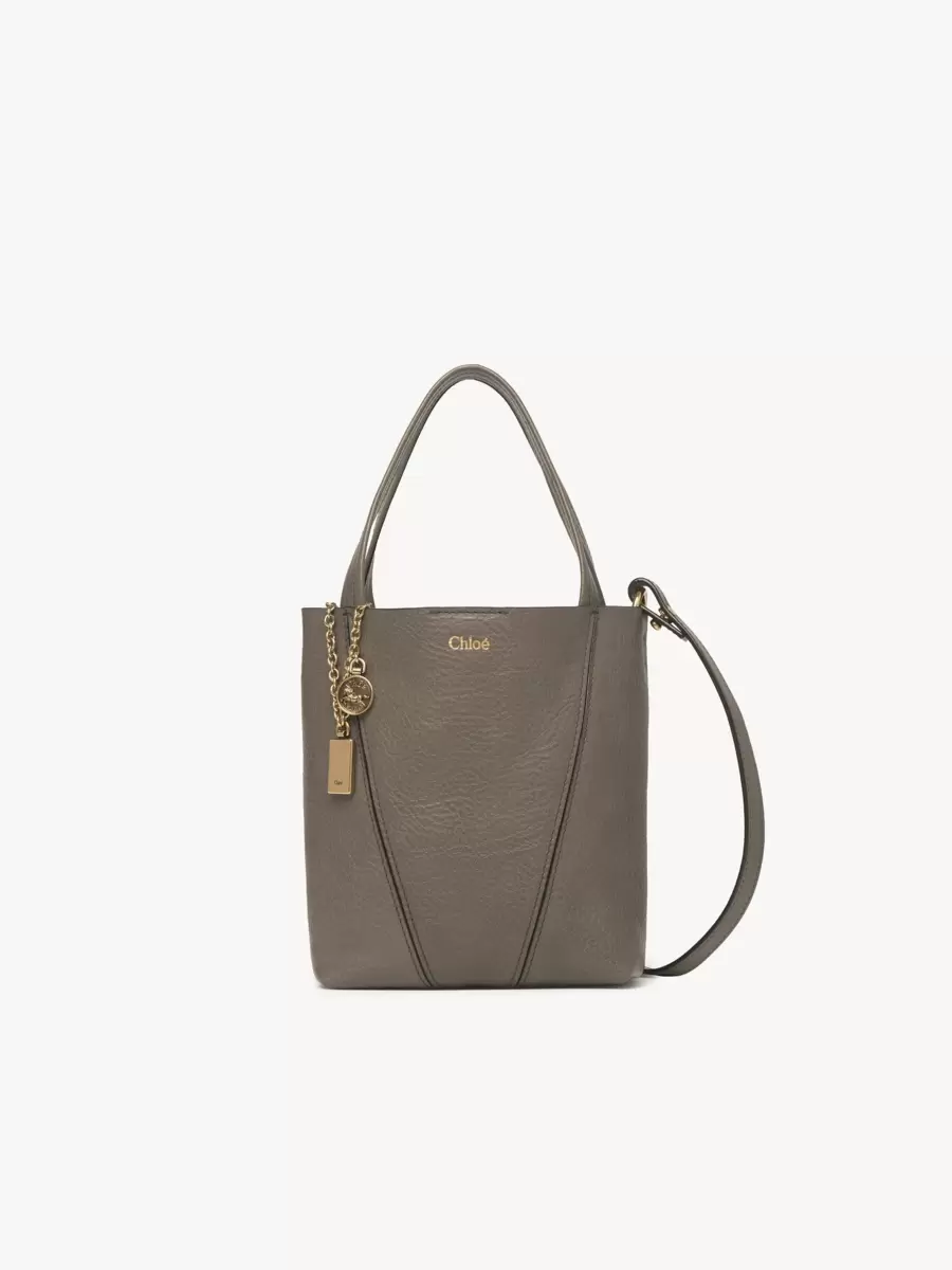 Crafted from shiny grained cowhide, the small Chloé Spin tote bag has a minimalist silhouette elevated with graphic lines. A dangling chain features the Maison’s signature Chloé and Horse Medals.