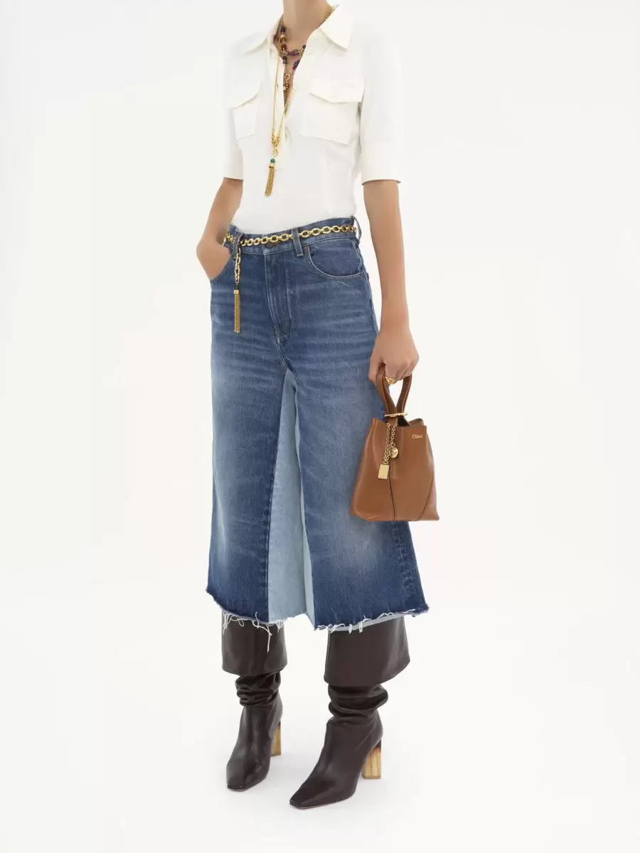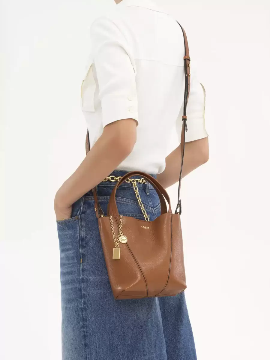 Crafted from shiny grained cowhide, the small Chloé Spin tote bag has a minimalist silhouette elevated with graphic lines. A dangling chain features the Maison’s signature Chloé and Horse Medals.
