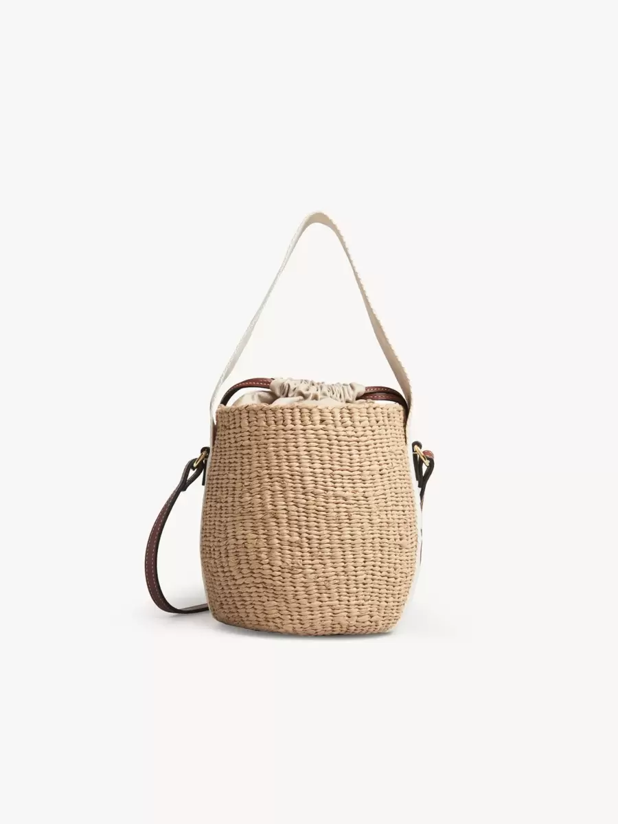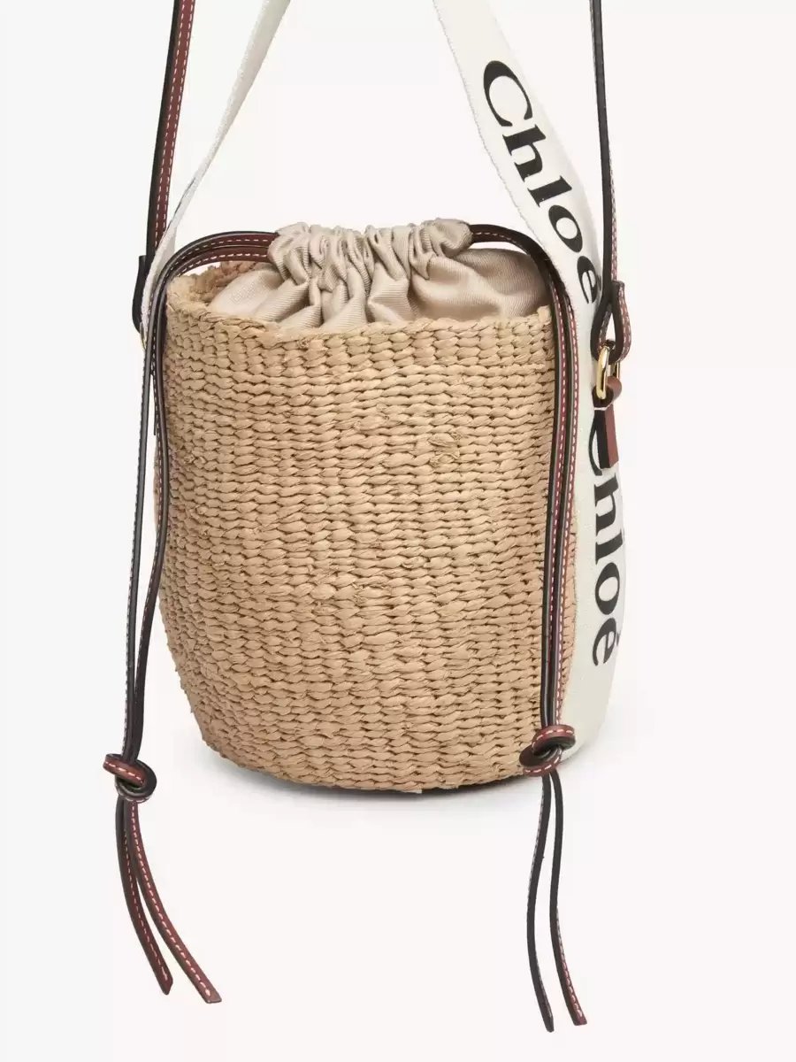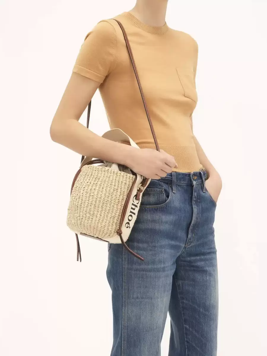 Crafted in a compact, round basket shape for an easy summer attitude, this small Woody basket is handwoven by independent craftswomen in Kenya. The basket has a drawstring fastening and a long leather strap for shoulder and cross-body wear. Echoing the Maison’s Woody mule, the line’s signature Chloé logo ribbon details the natural fiber and creates a wide handle.