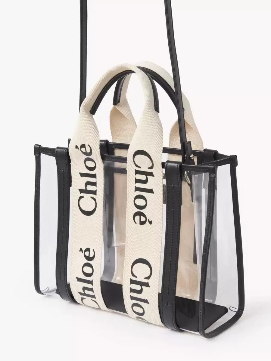 This small Woody jelly tote bag is elevated by contrasting vertical strips in calfskin and signature canvas ribbons featuring the Chloé logo.