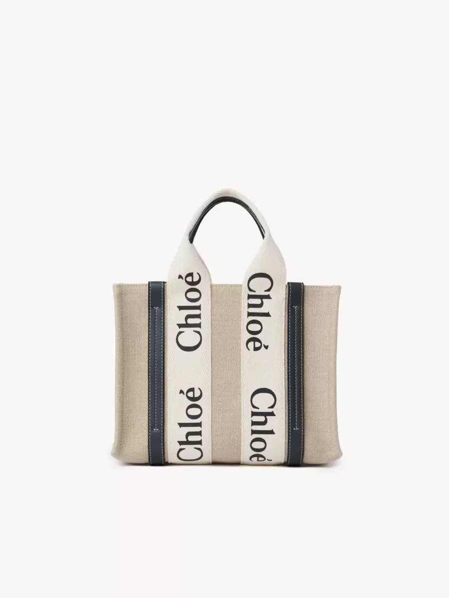 Crafted from lower-impact linen canvas detailed with shiny calfskin strips, this small Woody tote bag is a soft day bag with a removable long strap in addition to the top handles. The roomy inside compartment is unlined and includes a practical flat pocket in leather for an elevated touch. Carry this versatile small bag on the arm, shoulder or cross-body.
