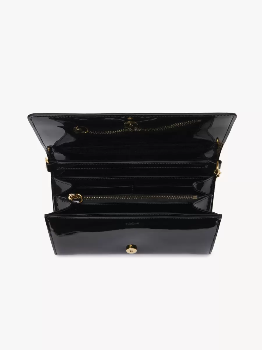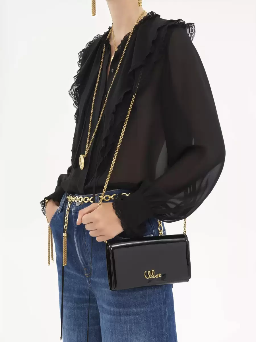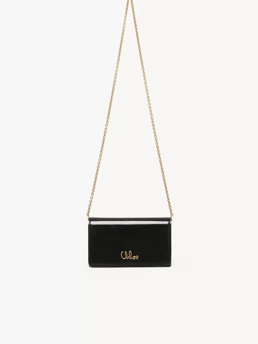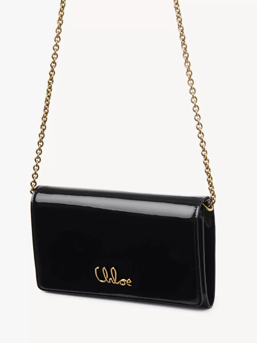 Crafted from patent calfskin, the Chloé Iconic flap wallet on chain combines a minimalist silhouette with a metallic signature from the Maison’s archives.