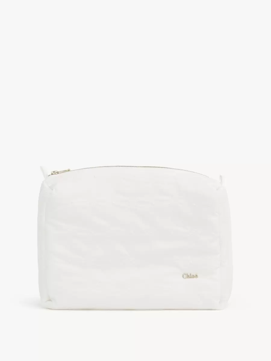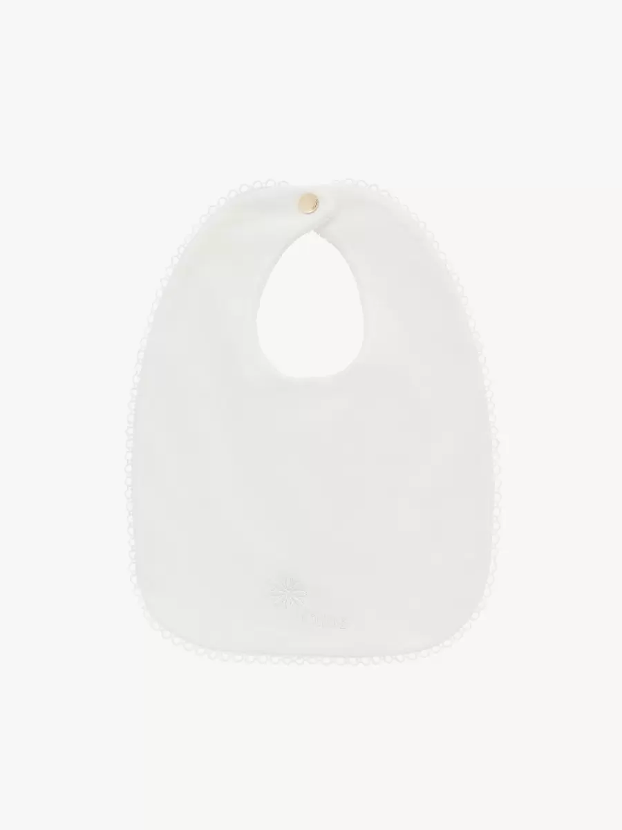 The muslin cloth and pouch are made of organic cotton gauze, while the bib is made of organic cotton interlock. Tonal flower embroidery embellishes all pieces, with a gold-tone Chloé logo plate finishing the zippered pouch.