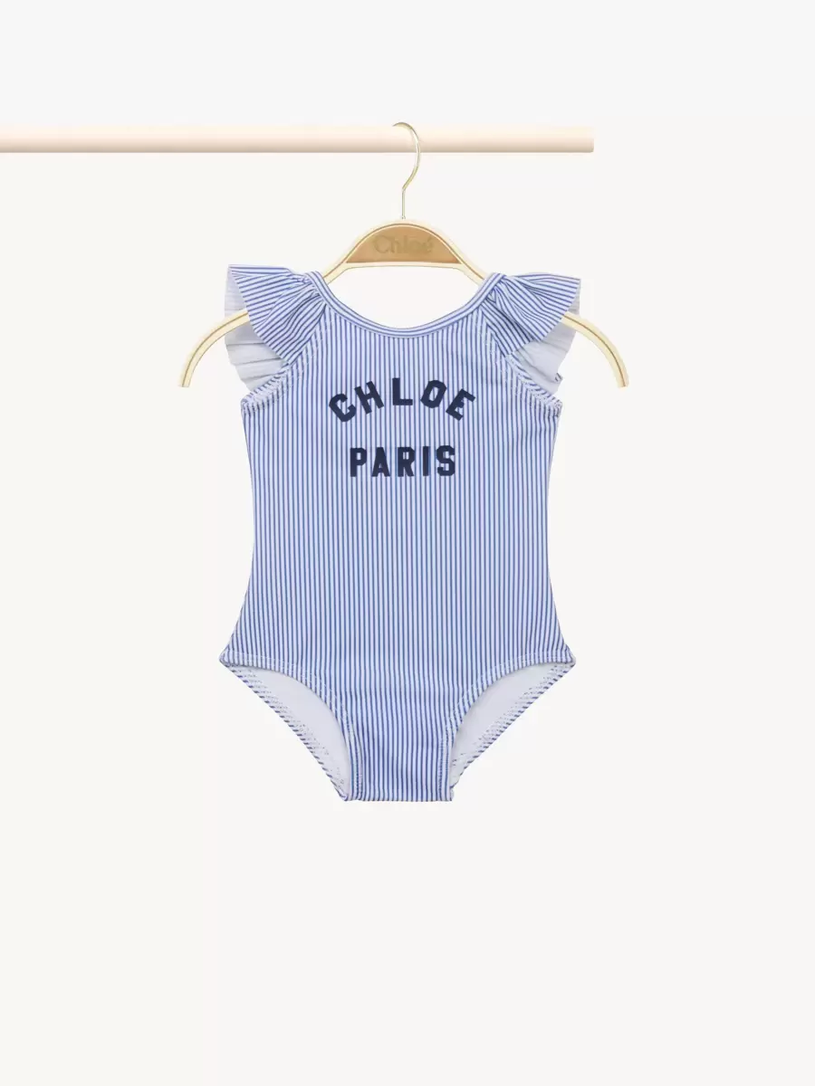 This striped one-piece swimsuit combines ruffled shoulders and a scoop back with a contrast Chloé Paris logo print at the front.
