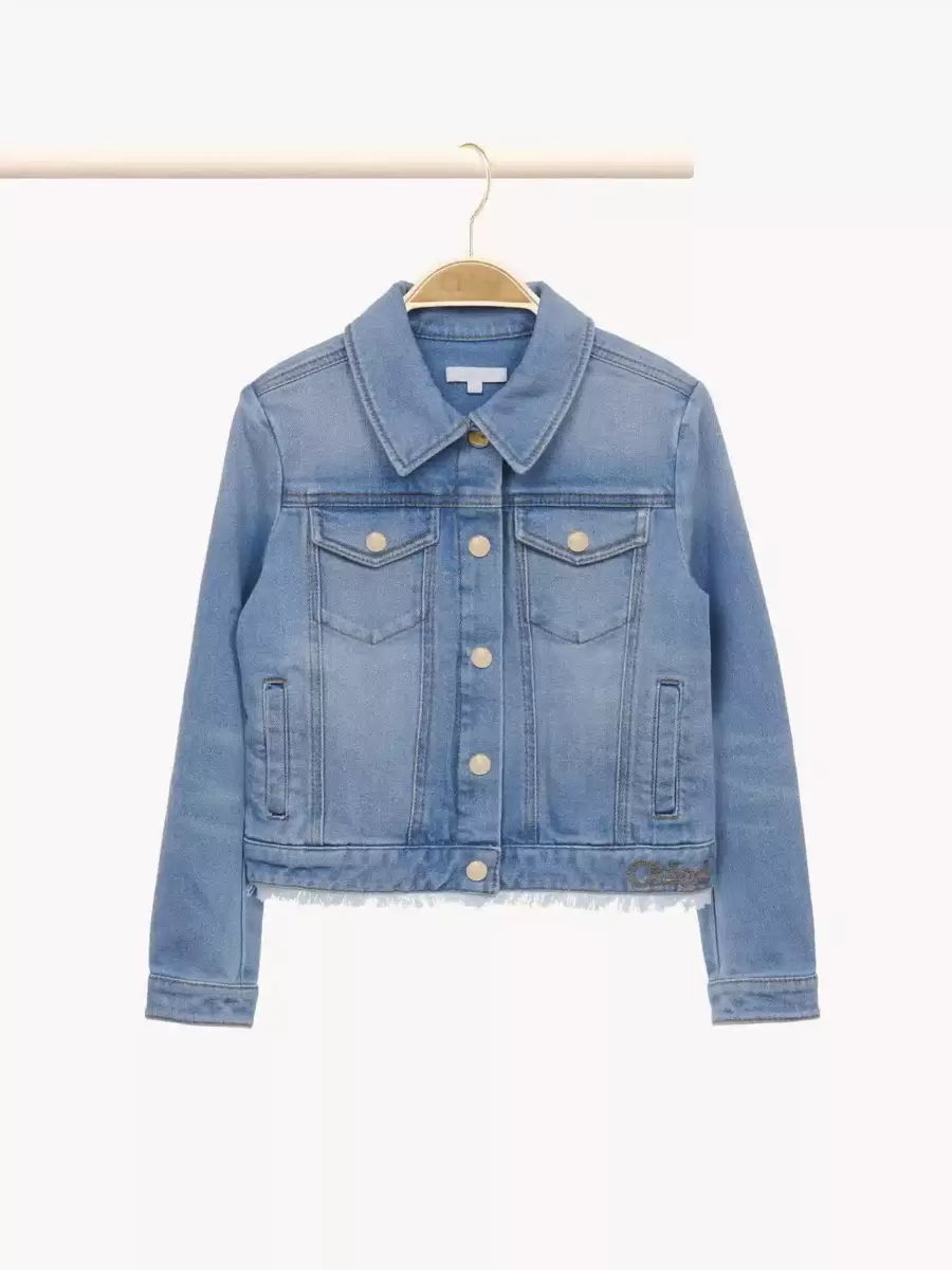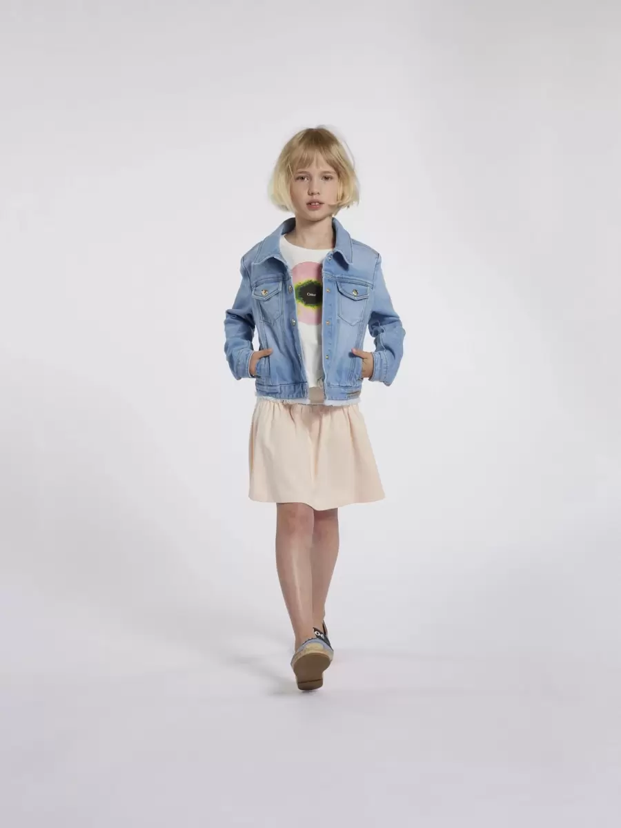 This cotton denim girls’ jacket has a faded effect and contrast top-stitching for a city attitude. Gold-toned Chloé-engraved snap buttons run through the front and detail the chest pockets, adding elegant hardware. A raw-edge hem and Chloé logo embroidery at the waist finish this essential piece.