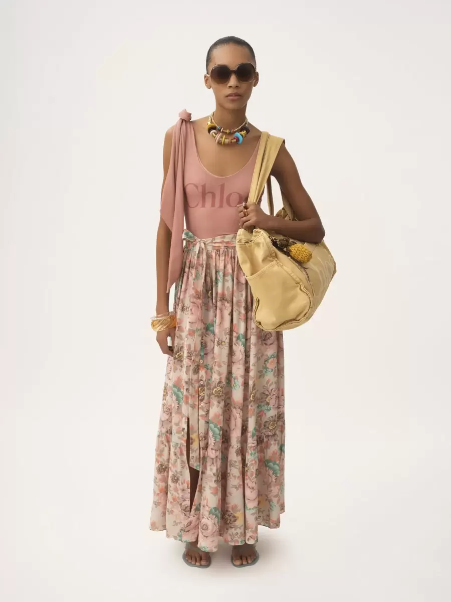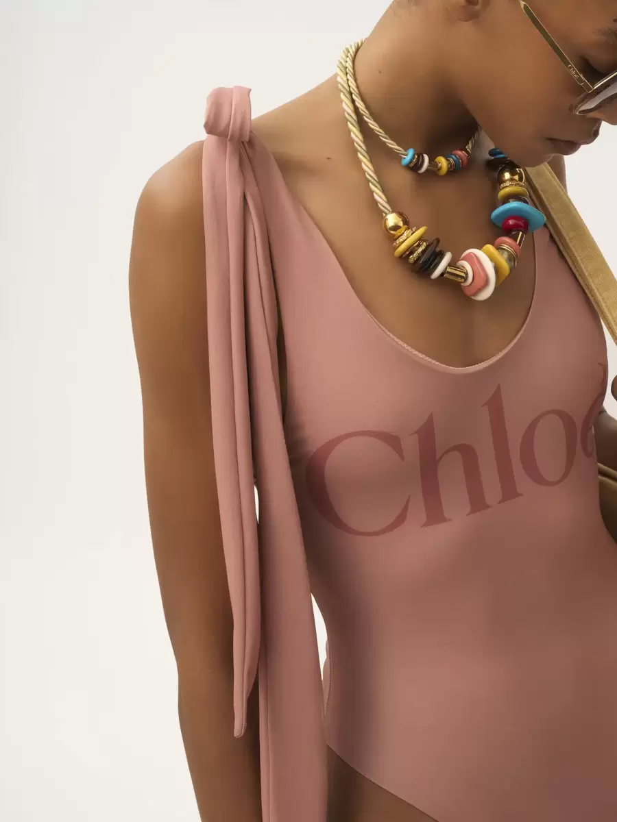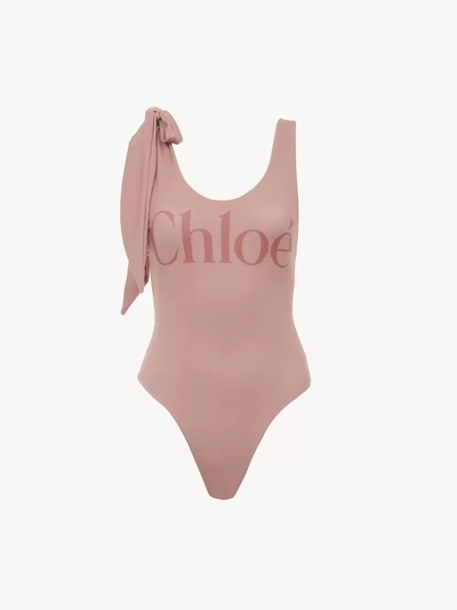 Scoop-neck one-piece swimsuit in shiny stretch nylon, featuring a knotted shoulder strap and a Chloé logo print at the chest.