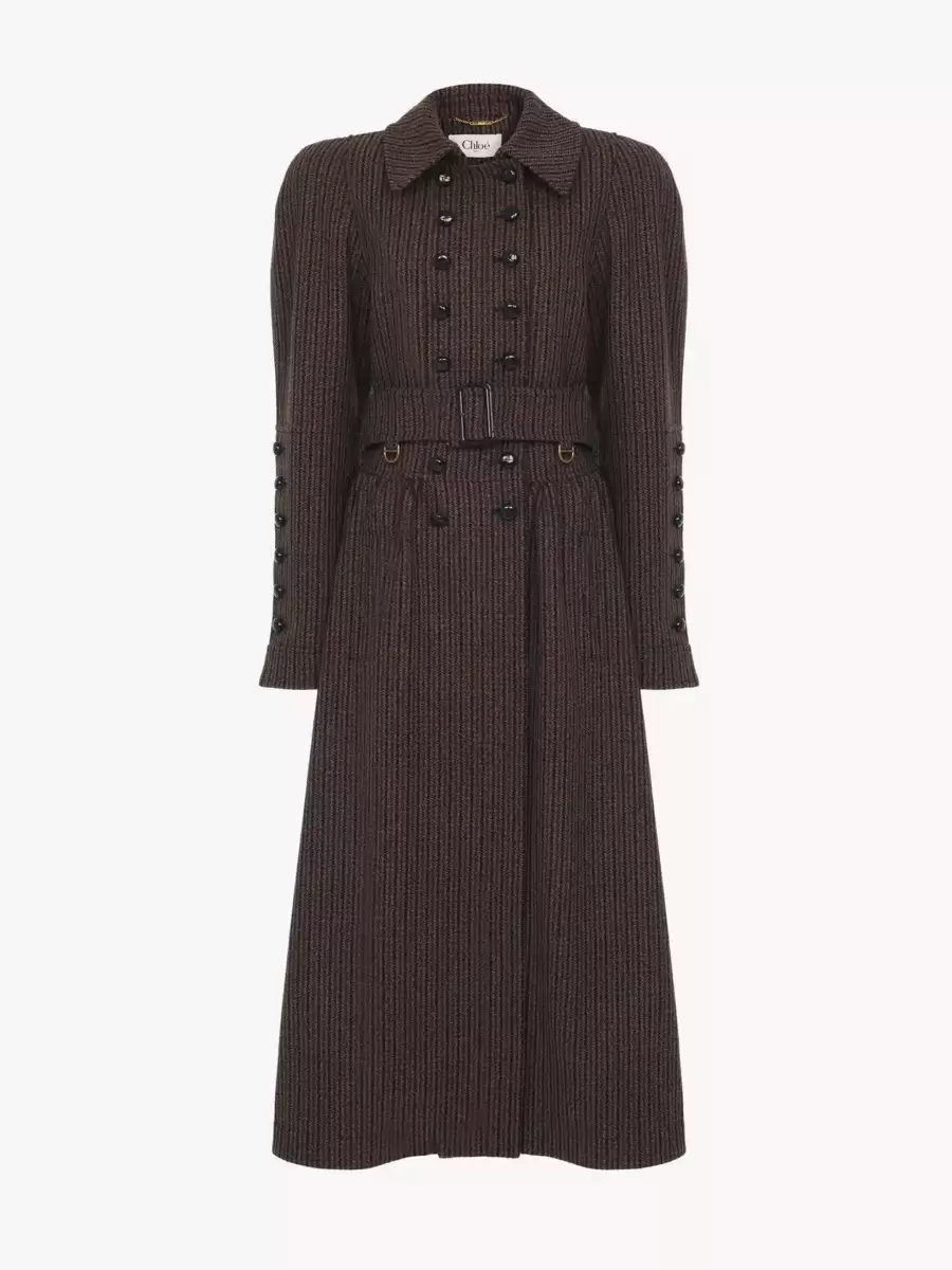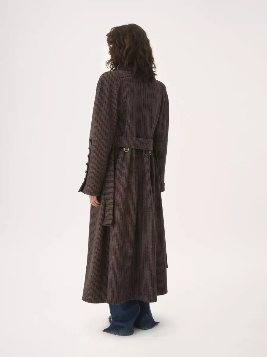 Double-breasted riding coat in lower-impact houndstooth wool, featuring slit sleeves, shiny leather buttons and a buckled belt finished with gold-tone D-rings.