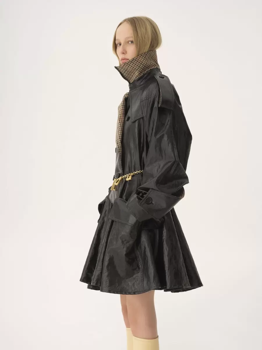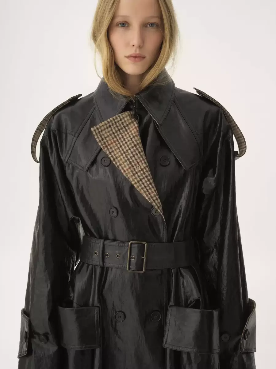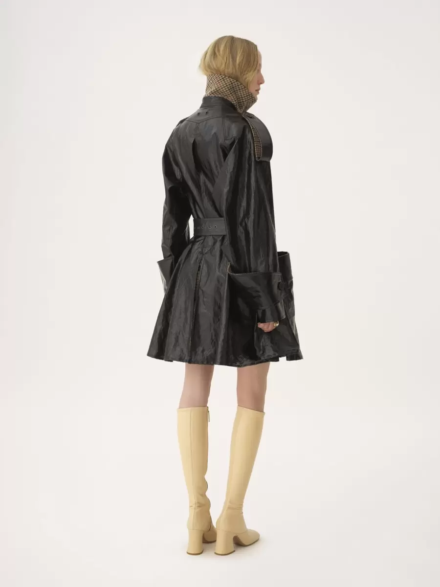 Double-breasted short riding coat in light coated linen with a check lining, featuring flap pockets, engraved horn buttons and a buckled belt finished with gold-tone D-rings.