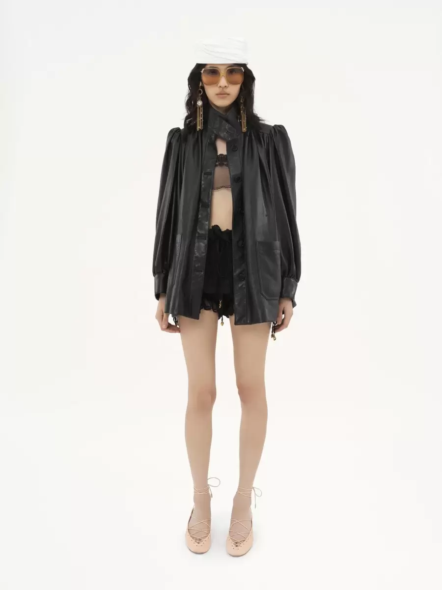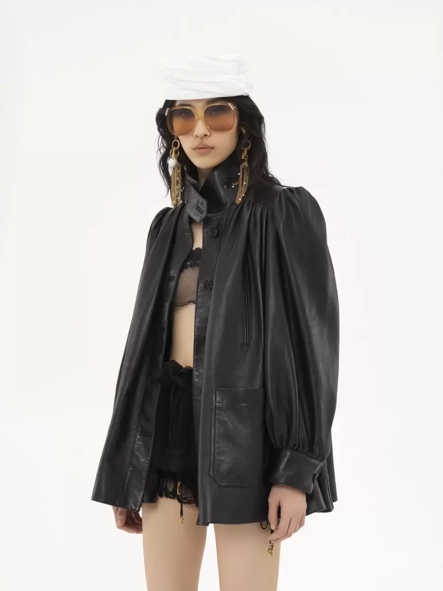 High-neck coat in plongé nappa leather with a gathered silhouette, featuring maxi patch pockets and engraved horn buttons.