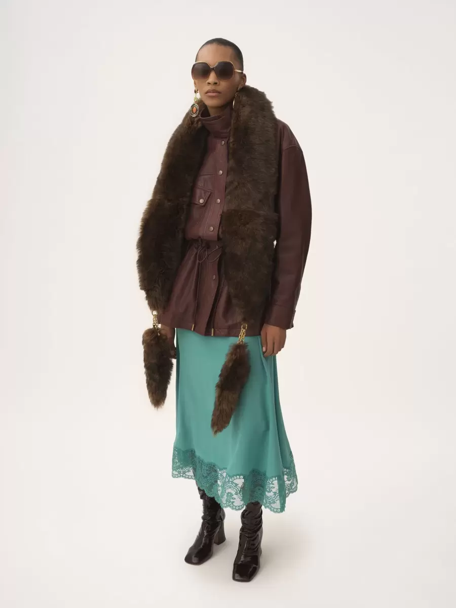 High-neck parka in classic plongé leather, featuring a chin-strap collar, oversized pockets, an elasticated drawstring waist and gold-tone snap buttons.