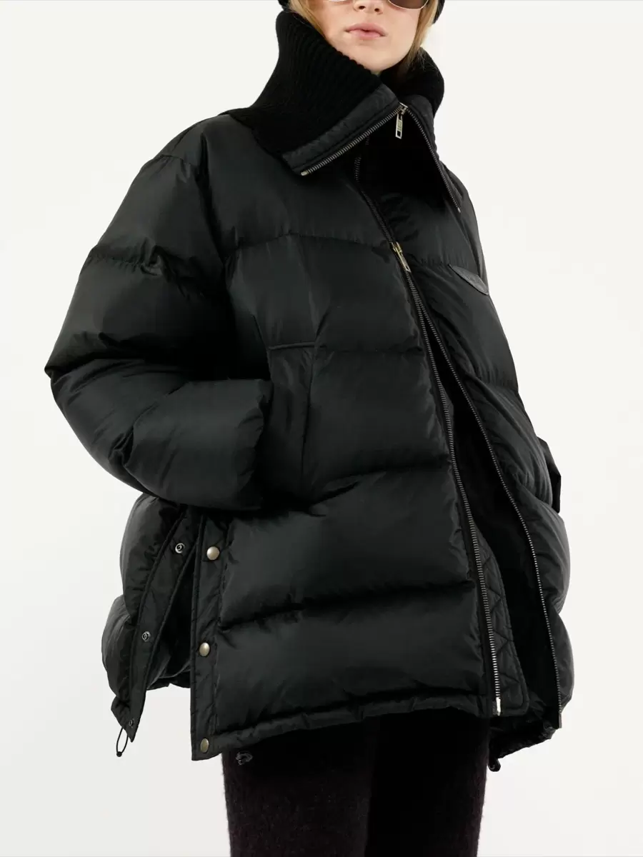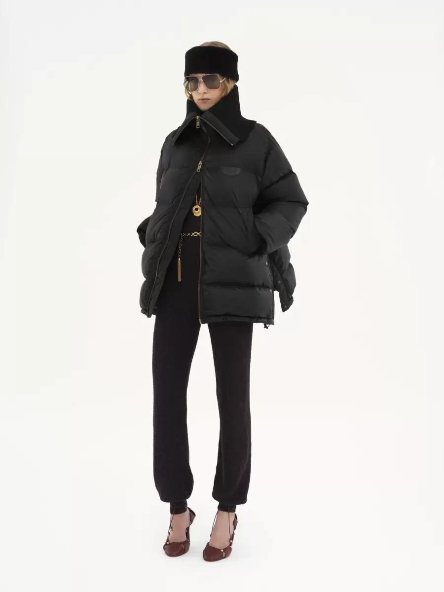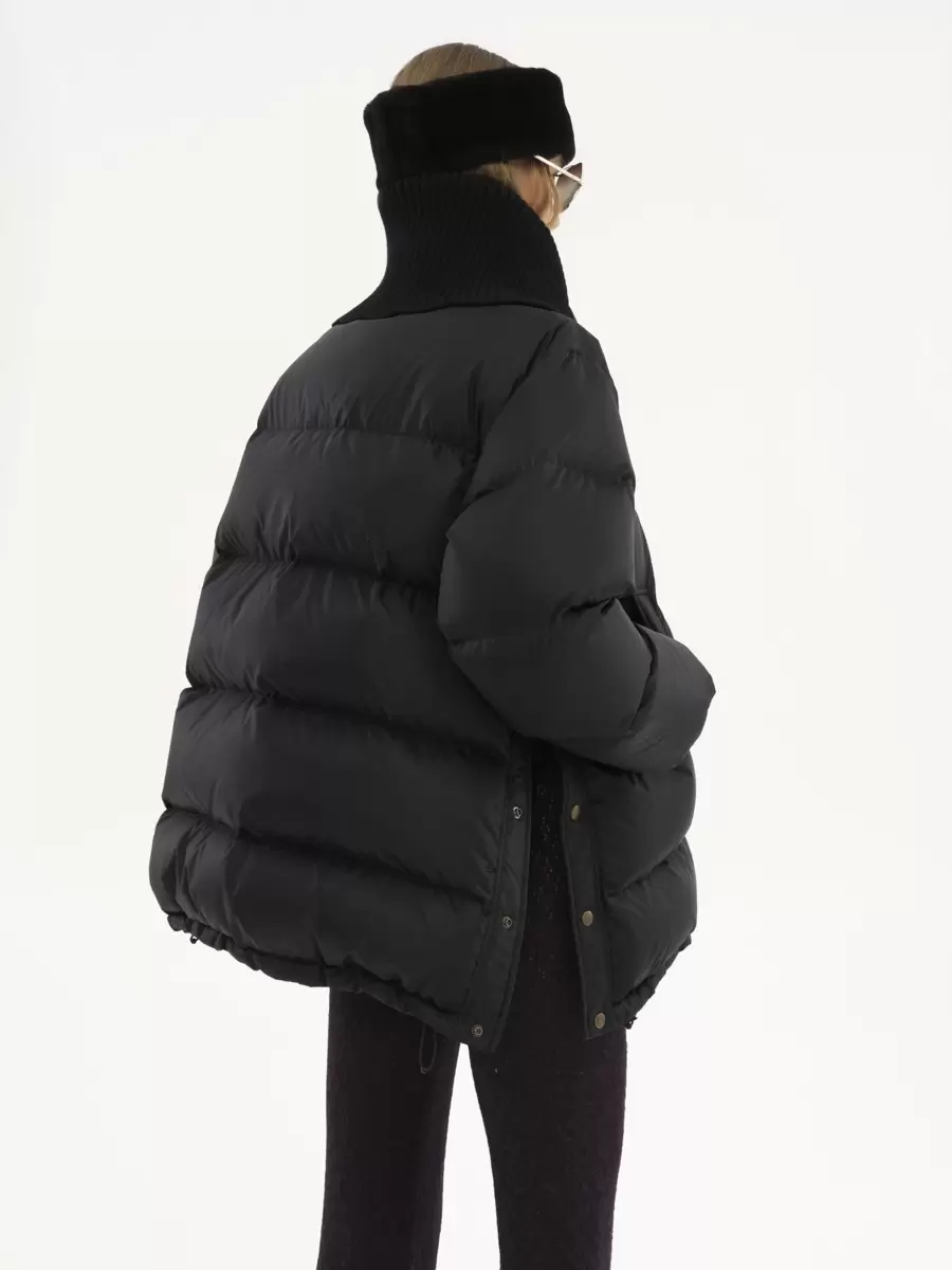 Oversized high-neck puffer jacket in shiny recycled nylon with scallop-edged ribbing at the neck and cuffs, snap buttons at the sides and a Chloé logo patch at the chest.