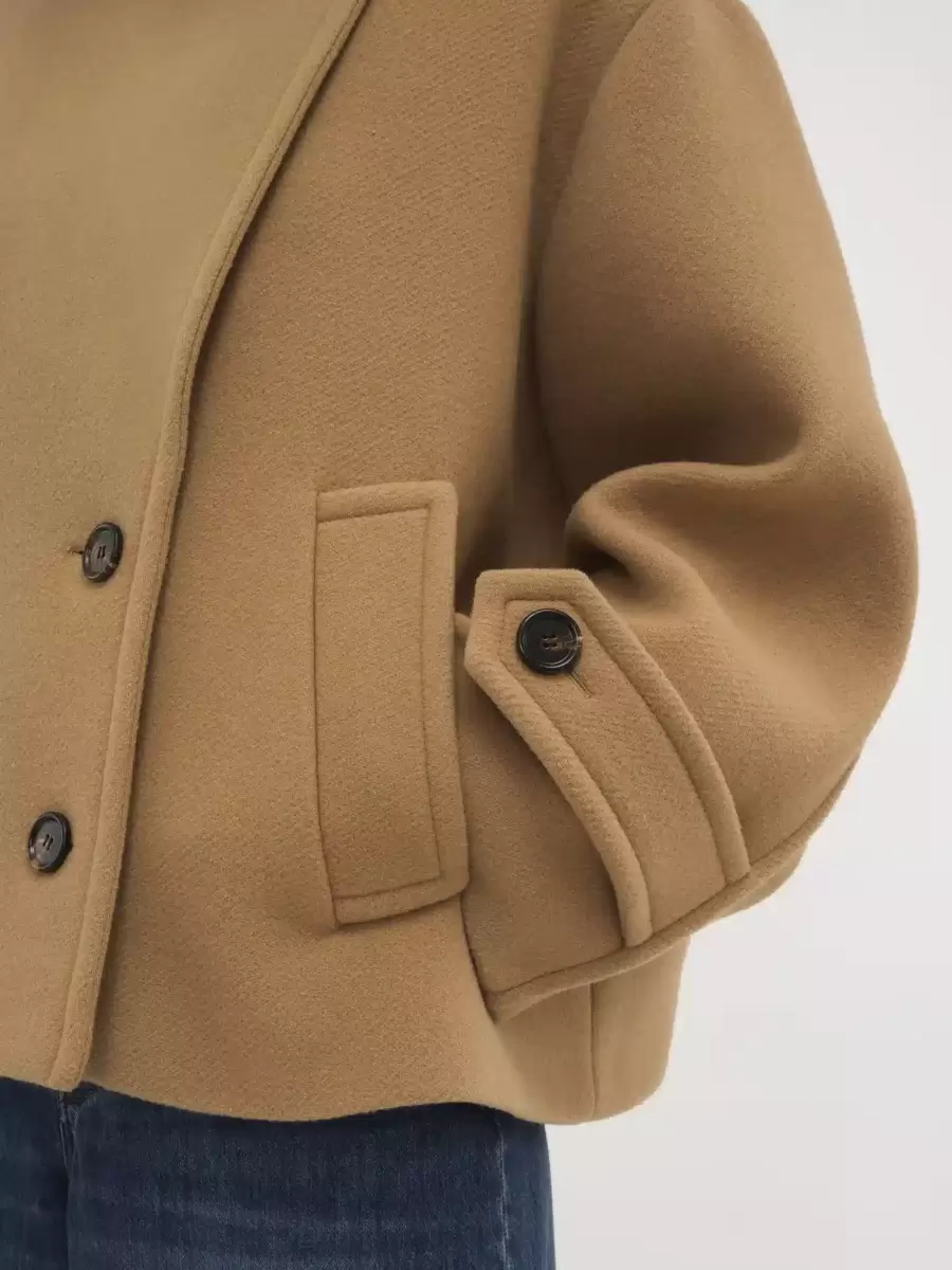 Double-breasted oversized short coat in iconic soft wool with a chin-strap collar and horn buttons.