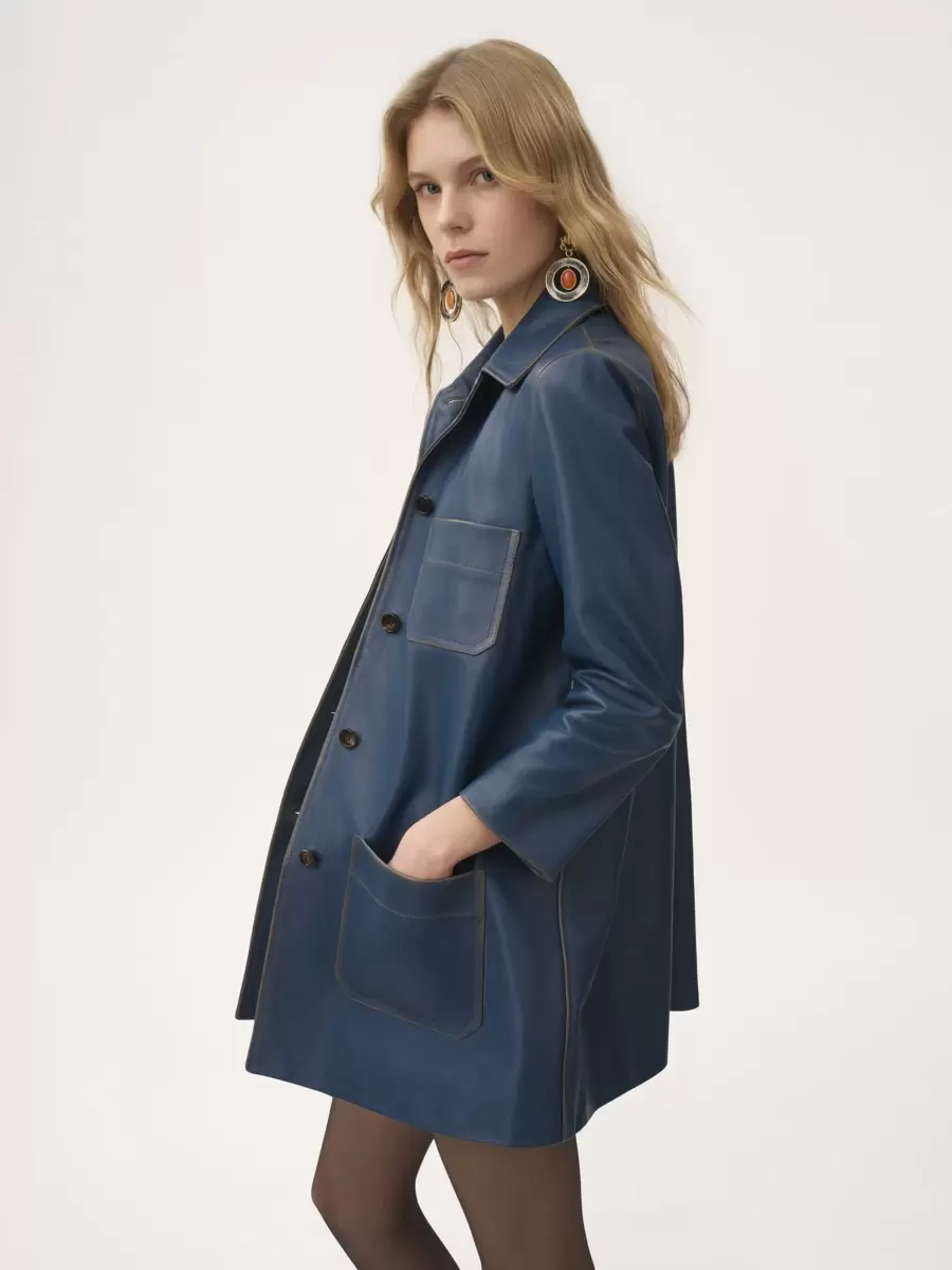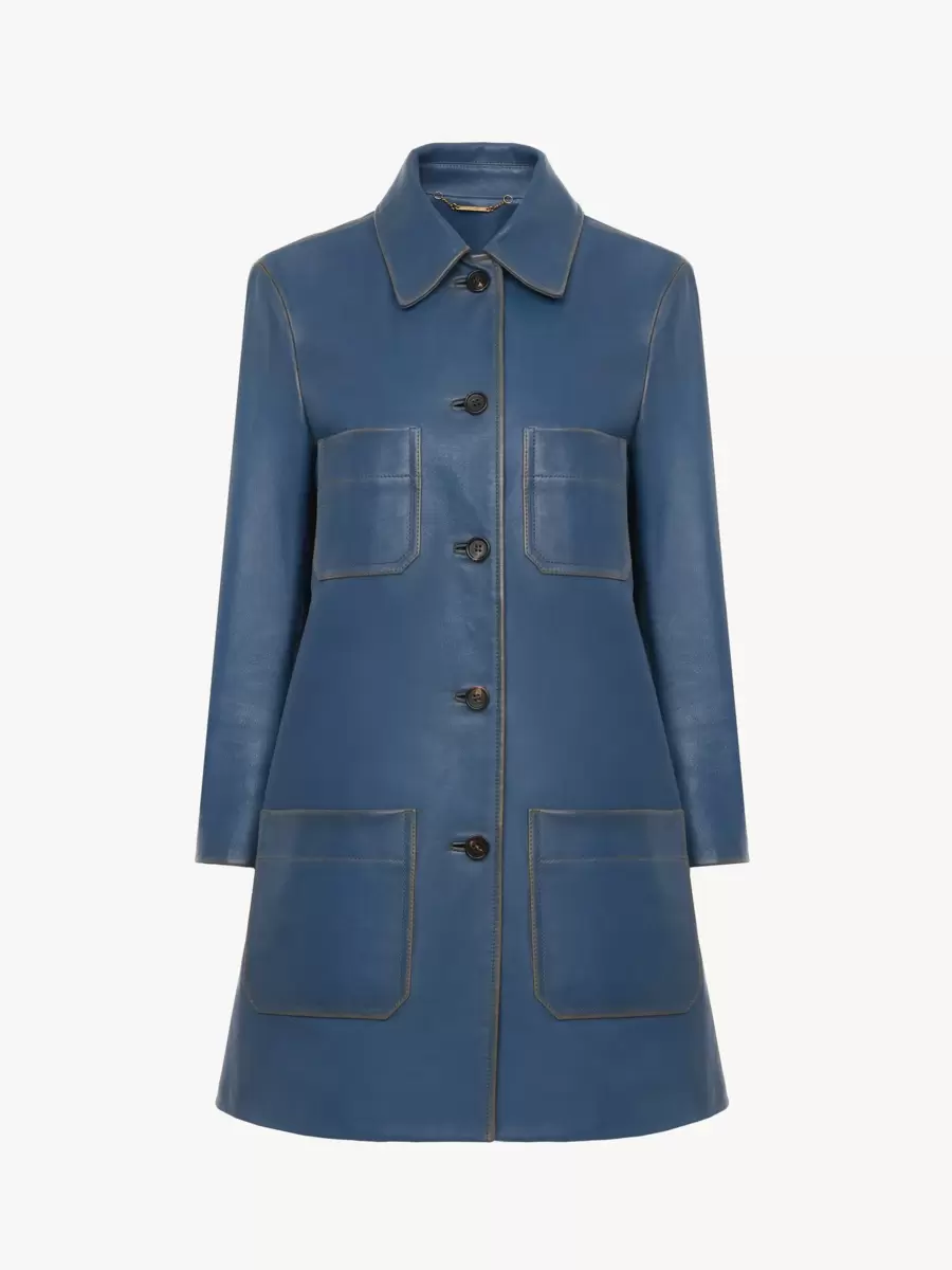 Single-breasted coat in heavy cowhide with patina detail along the seams. Patch pockets and engraved horn buttons finish this piece.