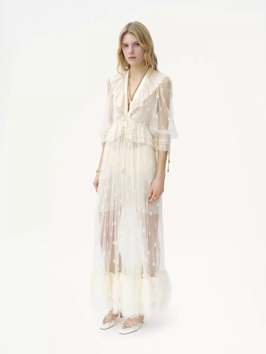 Gathered V-neck long dress in embroidered lace rooted in the Maison’s heritage, with a separate dress lining. The ruffle-trim dress features drawstring ties at the waist and cuffs, finished with gold-tone tips.