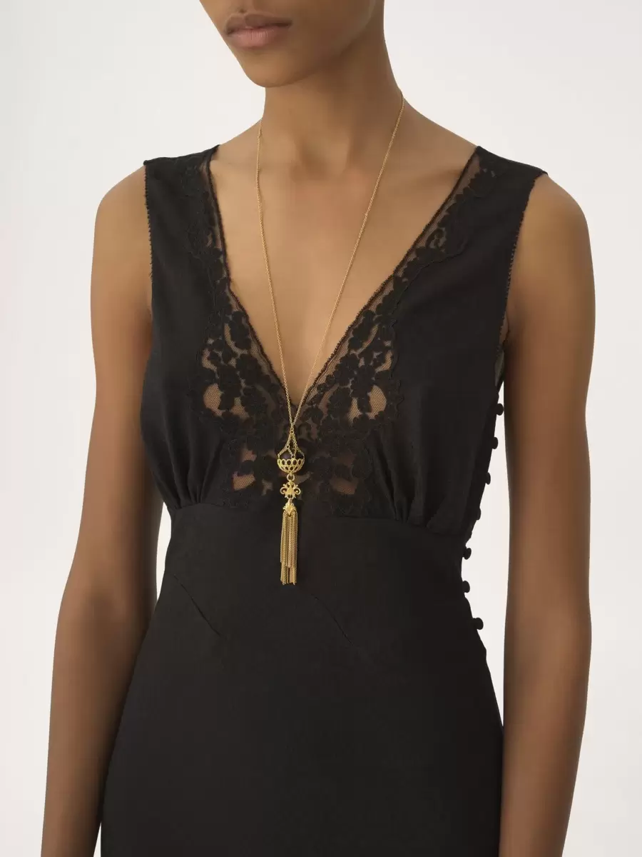 V-neck sleeveless column dress in mini floral jacquard organic silk with lace inserts, featuring fabric-covered buttons and a ribbon tie.