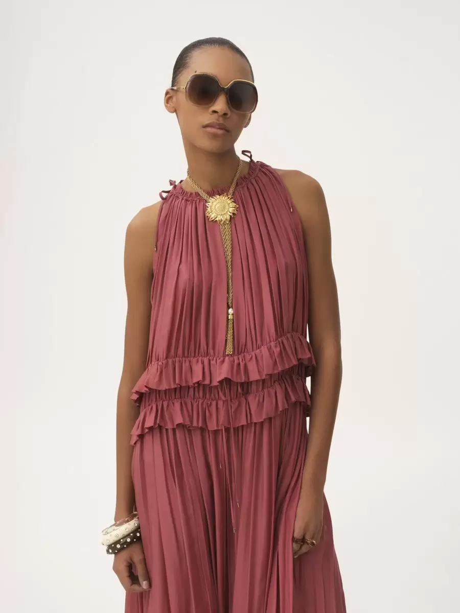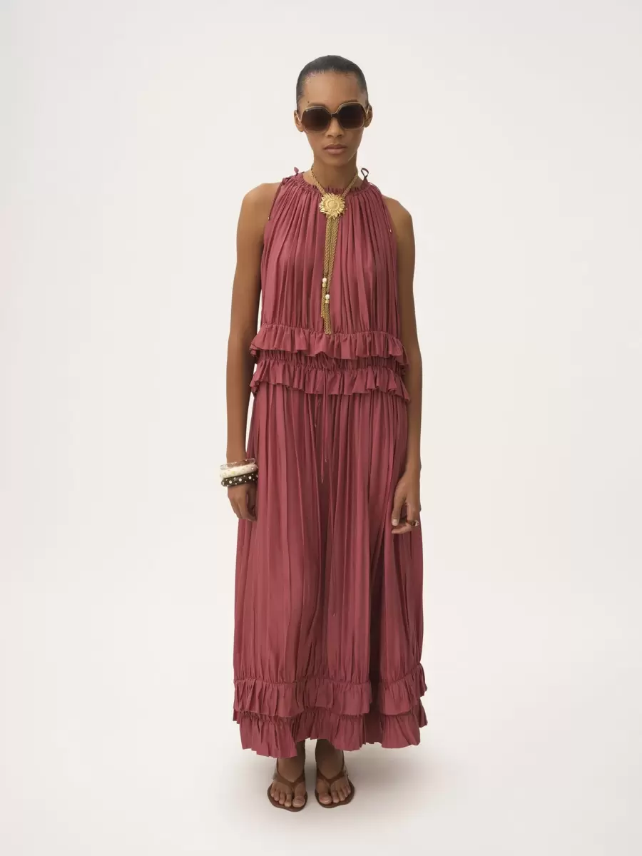 Sleeveless long dress in washed silk pongé with a gathered, tiered silhouette and ruffle trims. The drawstring neck and waist are fastened with dangling ties featuring gold-tone metal tips.