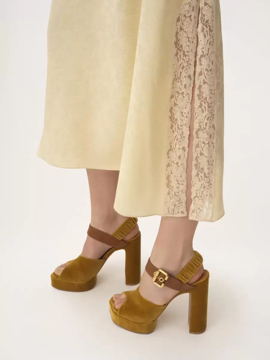 Thin-strap midi dress in organic silk with a roses jacquard, featuring lace inserts and gathered details.