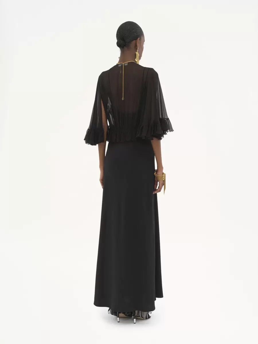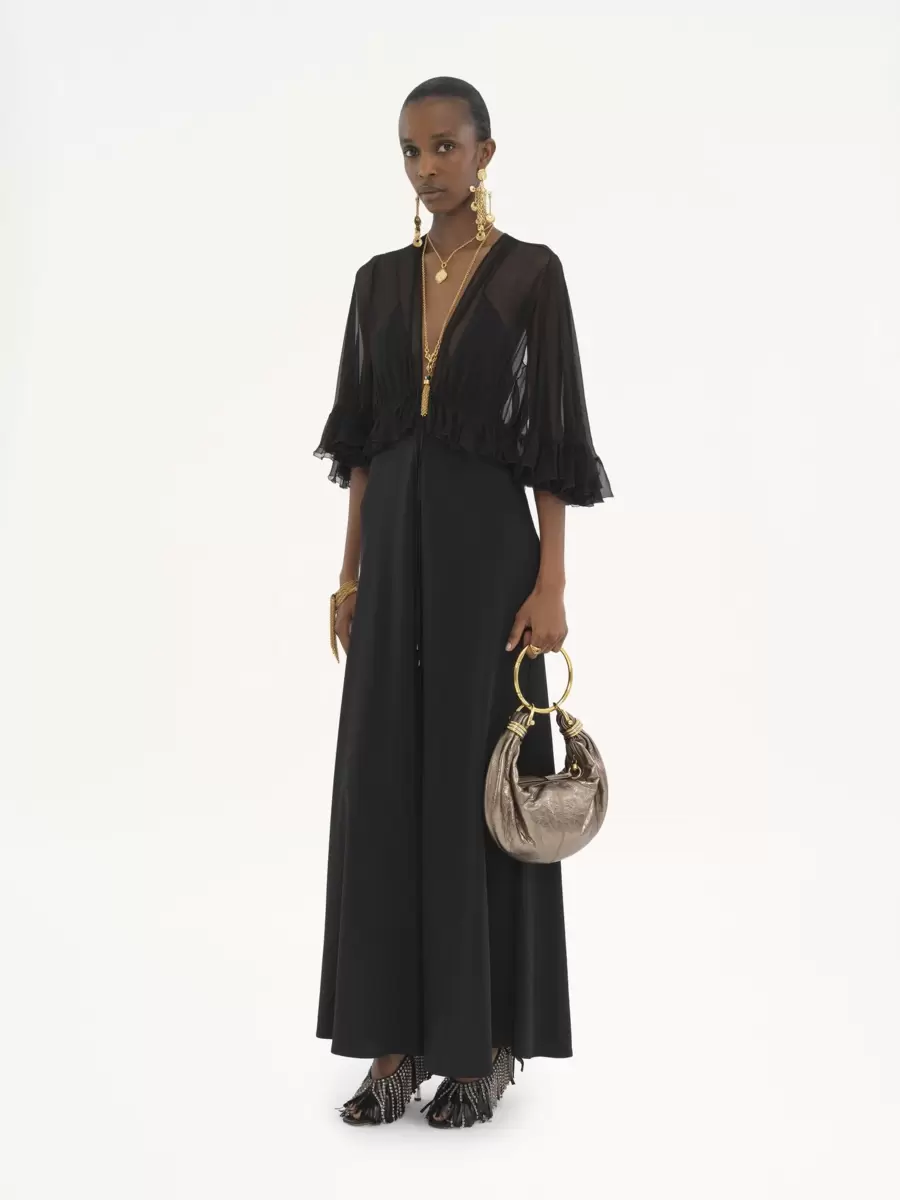 Fluid V-neck long dress in washed crêpe satin with silk-mix lining, featuring gathered details, ruffled trim and dangling ties finished with gold-toned metal tips.