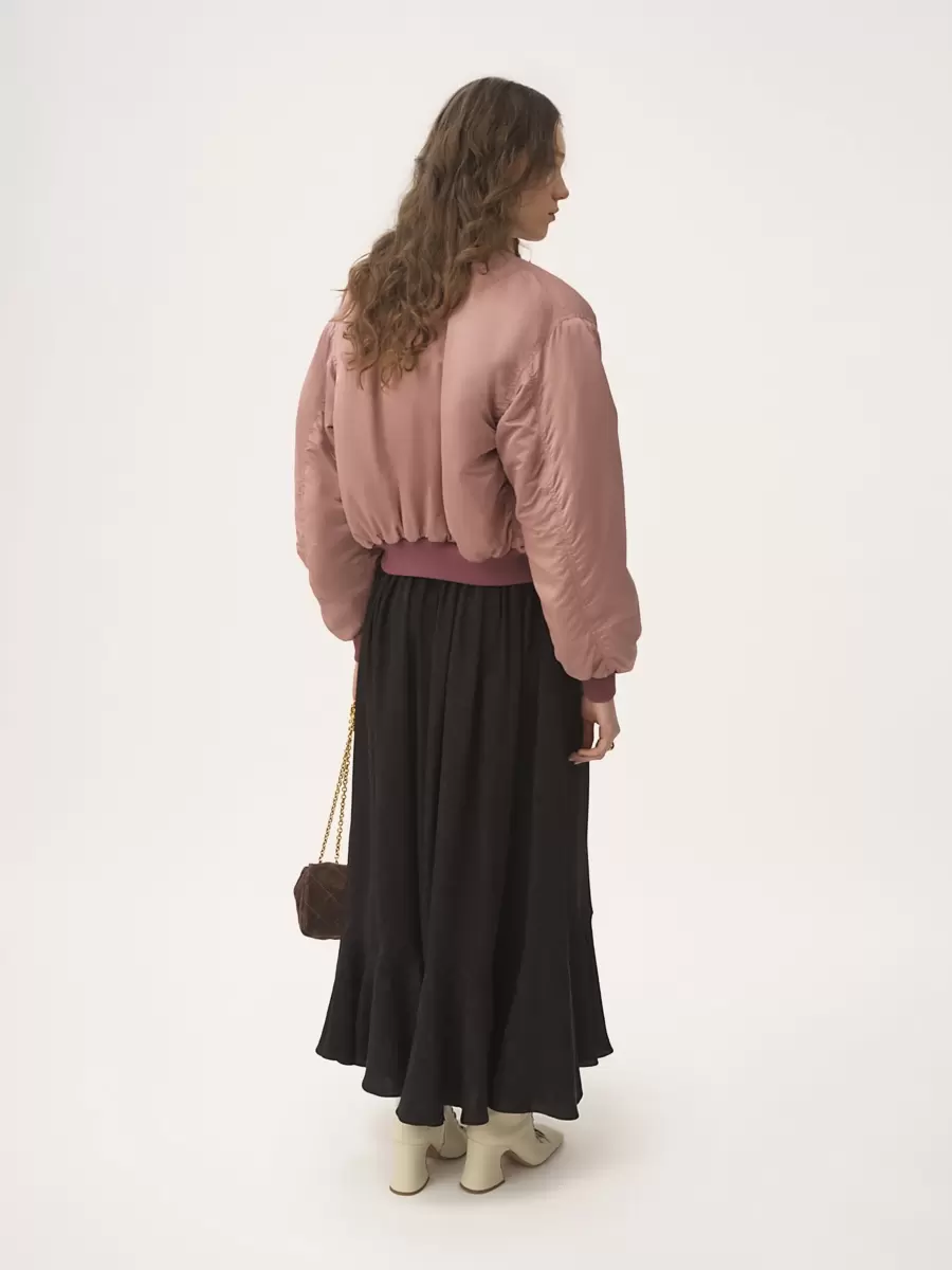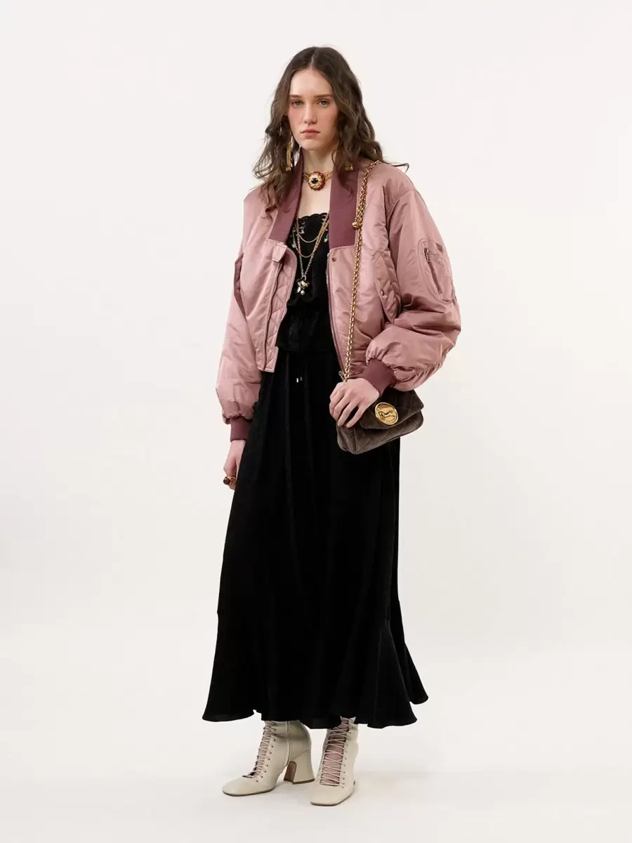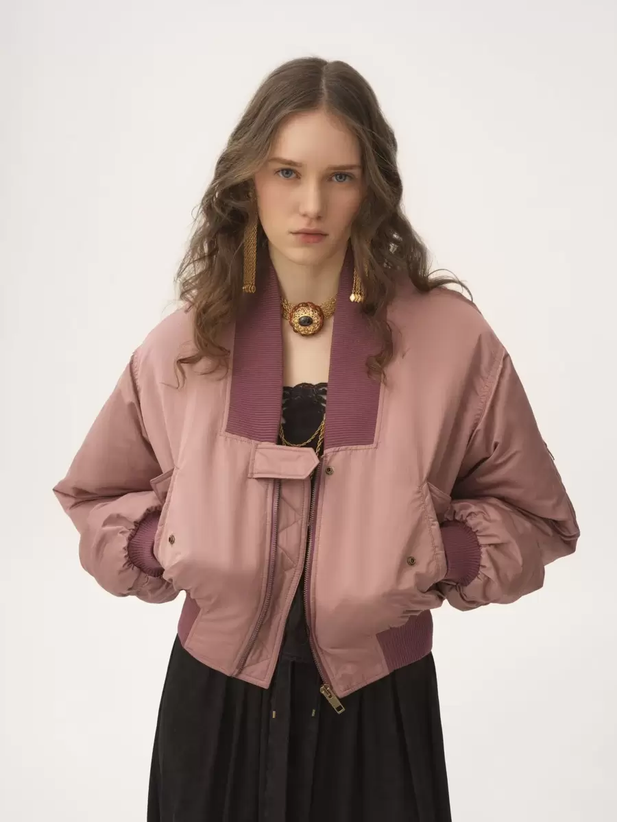 Maxi-collar bomber jacket in nylon with contrast ribbed trims, buttoned flap pockets and a zippered sleeve pocket.