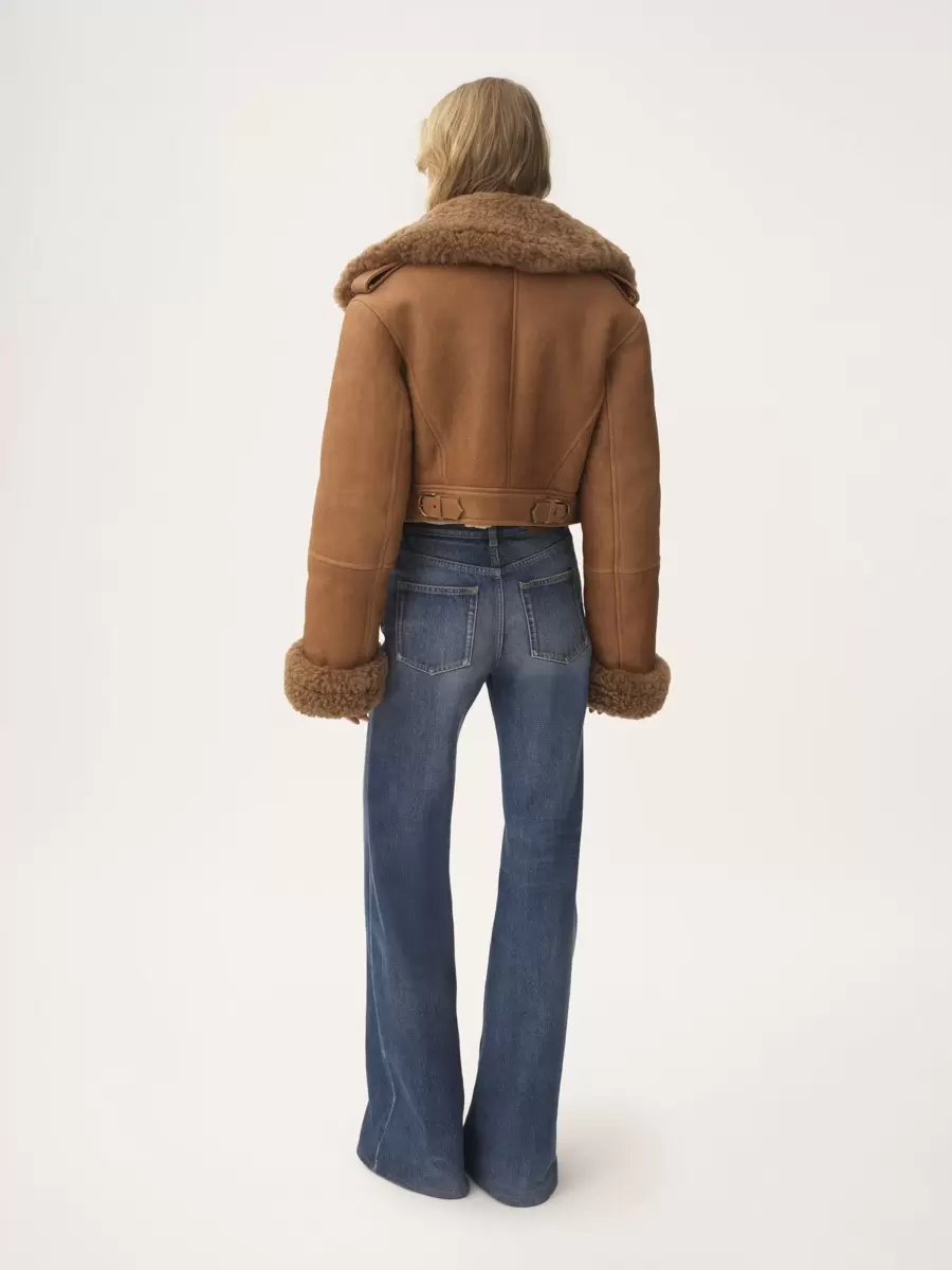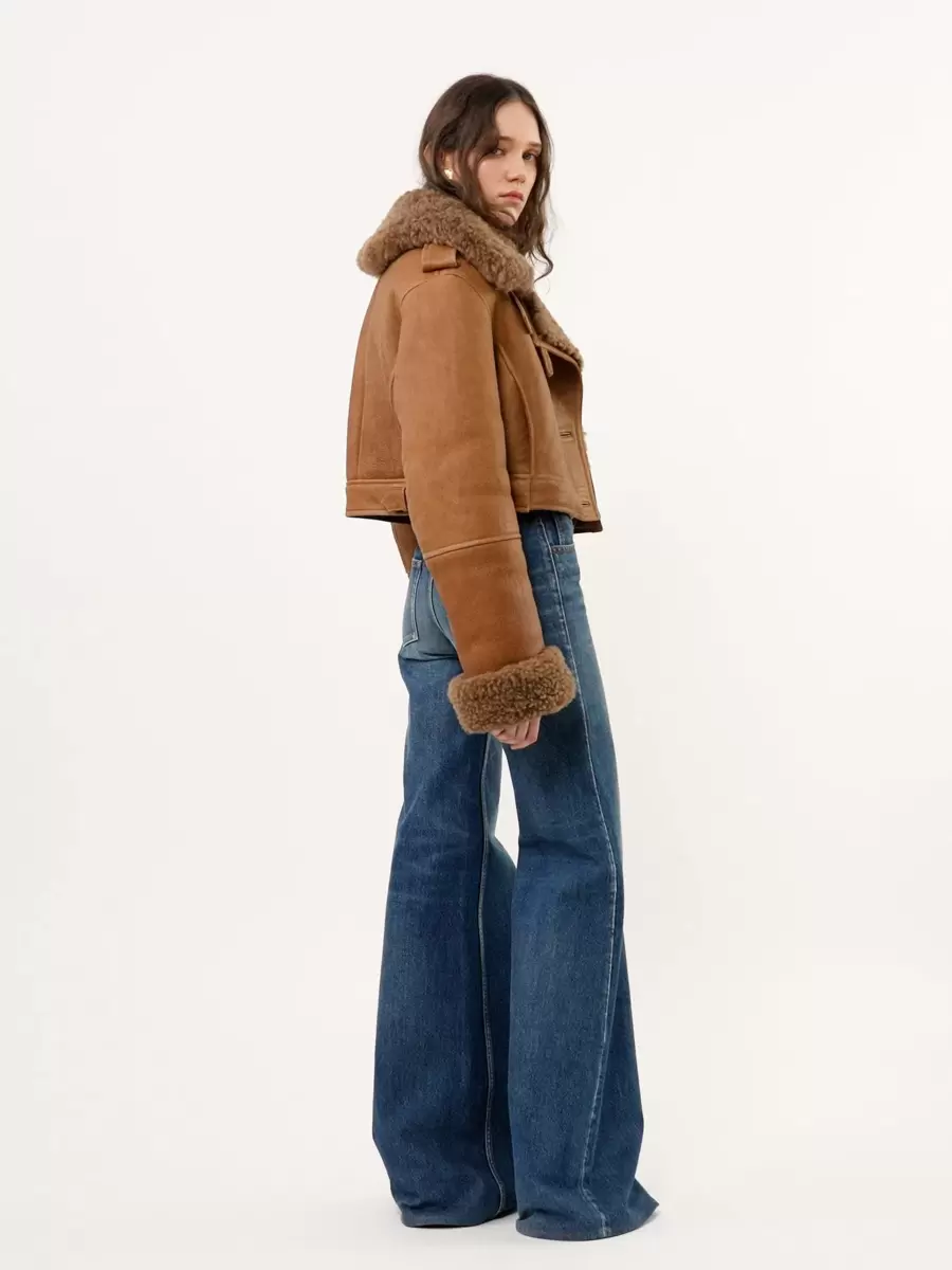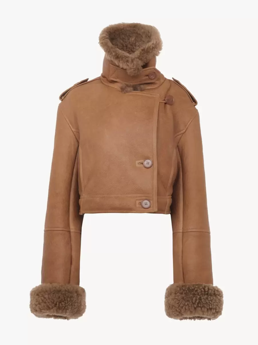Cropped boxy jacket in Icelandic wooled sheepskin trimmed with shearling, featuring a high neck, engraved horn buttons and shoulder tabs.