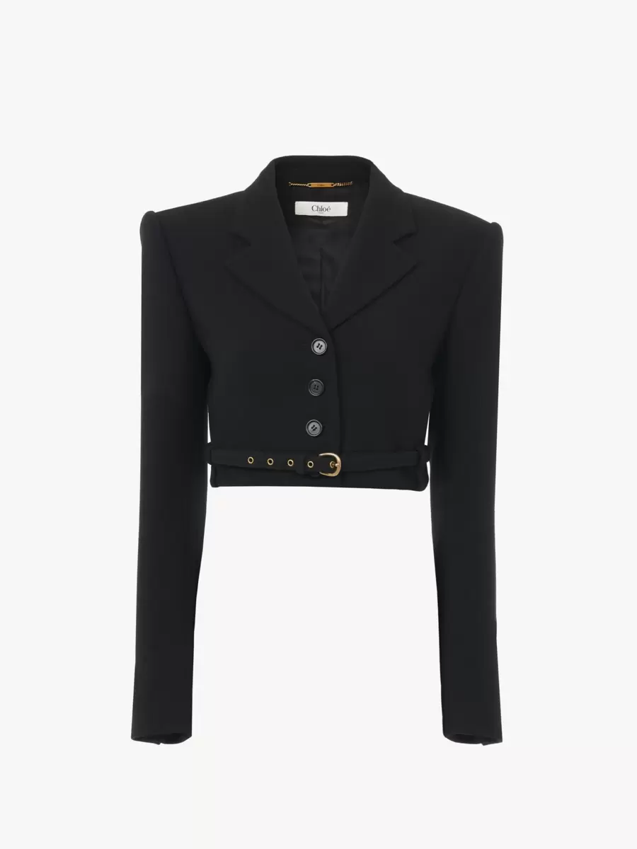 Cropped Spencer jacket in lower-impact wool crêpe, featuring a buckled belt and engraved horn buttons.