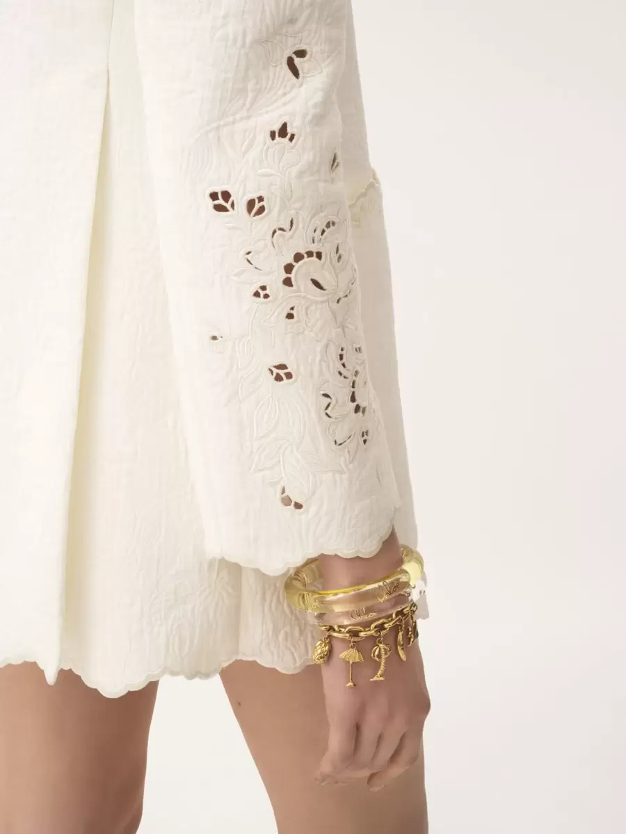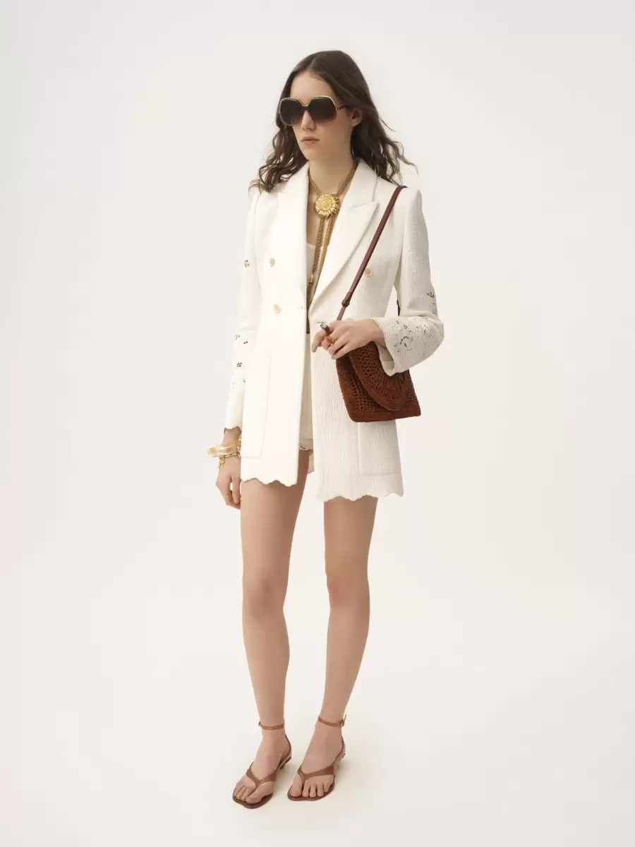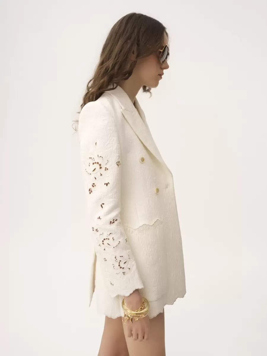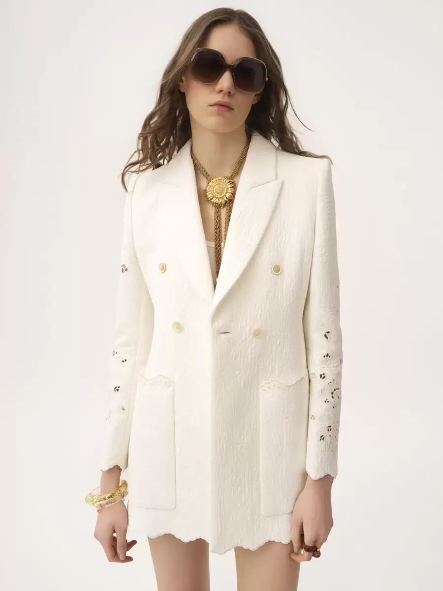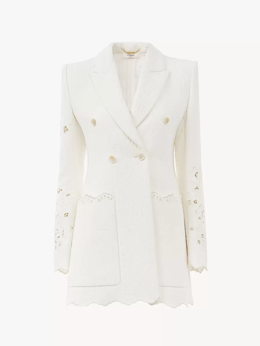 Double-breasted tailored jacket in a quilted floral jacquard cotton mix with floral broderie anglaise and scalloped trims, featuring oversized front patch pockets.