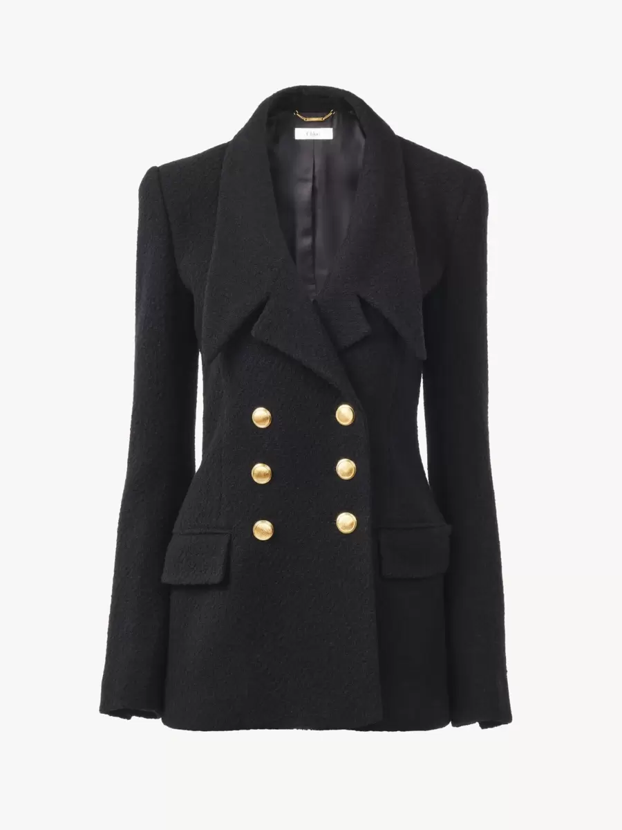 Double-breasted tailored jacket in wool bouclette, featuring gold-tone buttons and front flap pockets.
