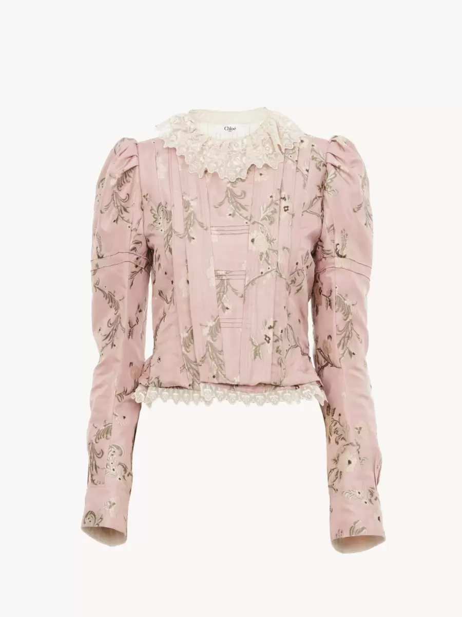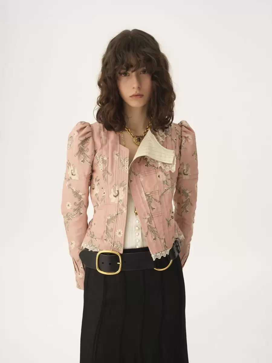 Embroidered baroque fitted jacket in a floral jacquard silk-mix taffeta, featuring lace embellishments, puff shoulders and a hook-and-eye closure.