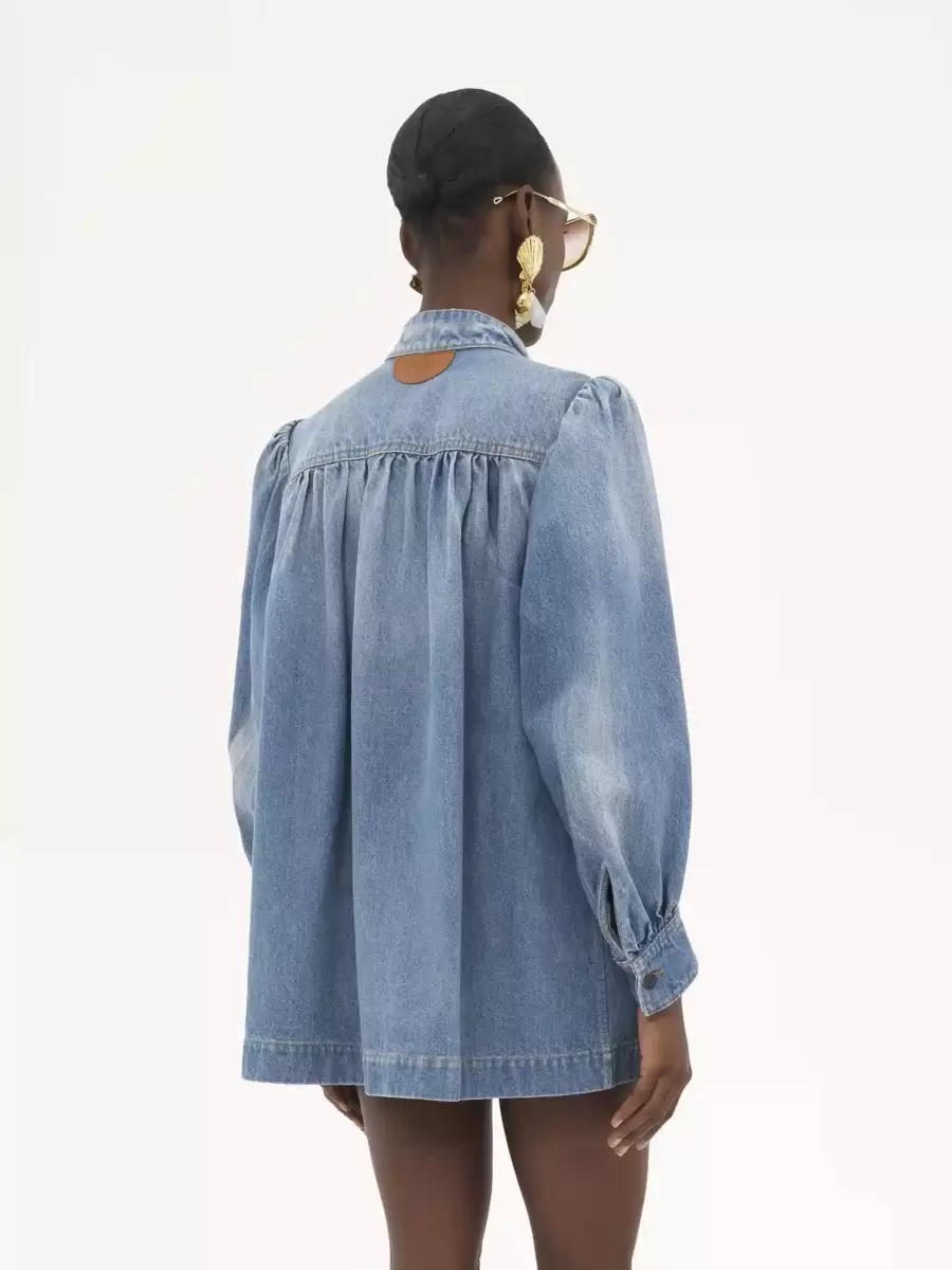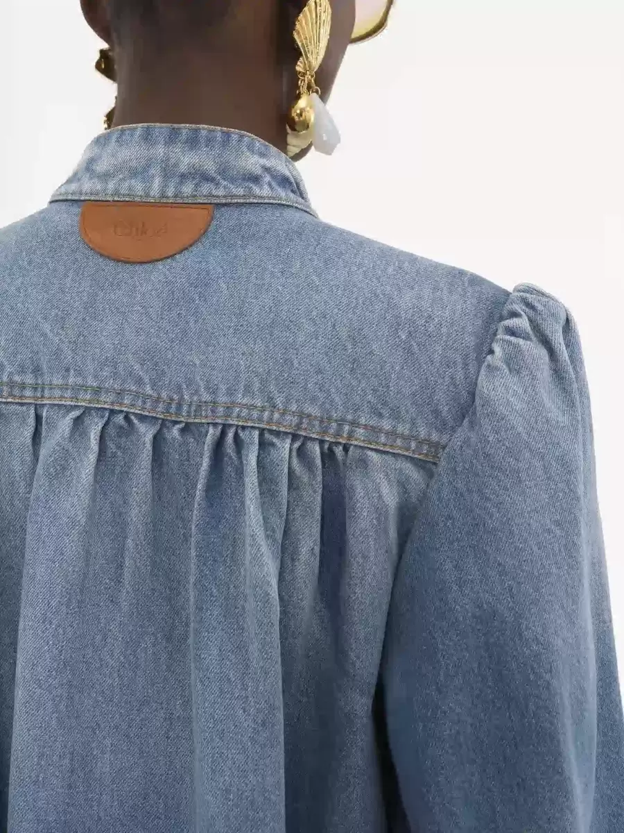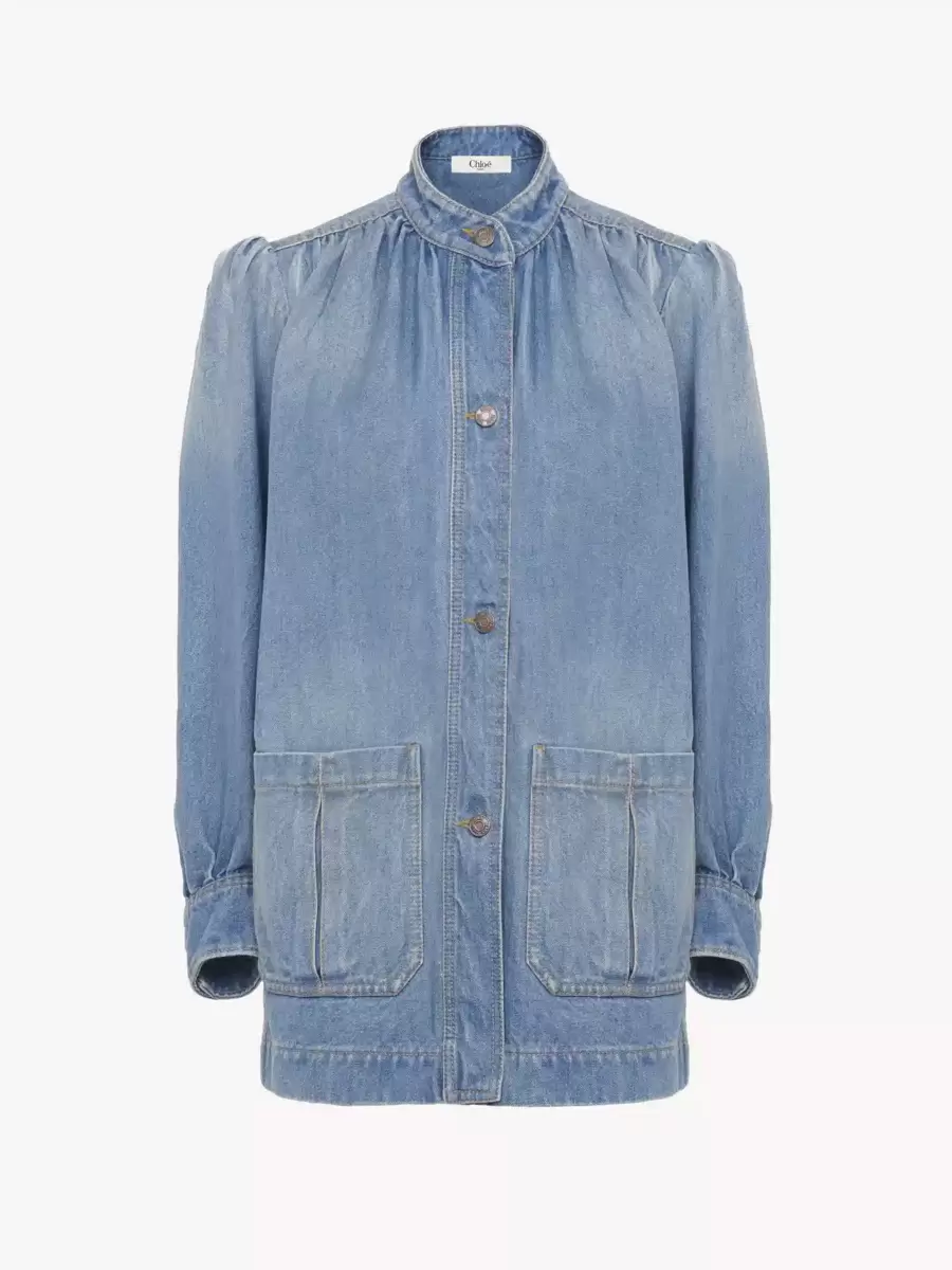 High-neck gathered jacket in light marble wash organic cotton denim, featuring puff sleeves, maxi patch pockets and Chloé-engraved jean buttons.