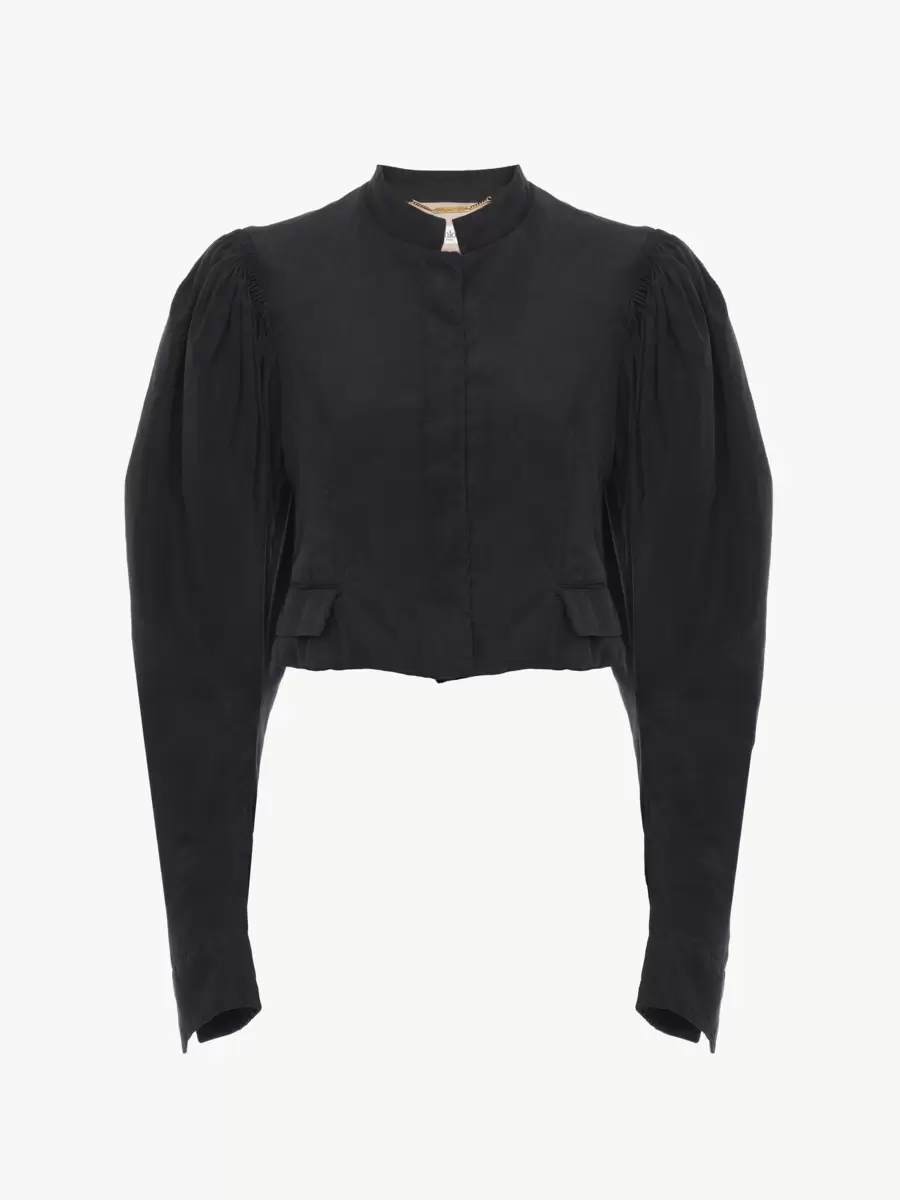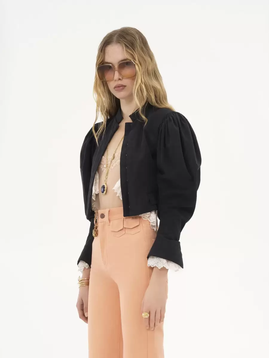 Puff-sleeve cropped jacket in light silk faille, cinched at the cuffs. Mini flap pockets, hook fastenings and fabric-covered buttons finish this piece.