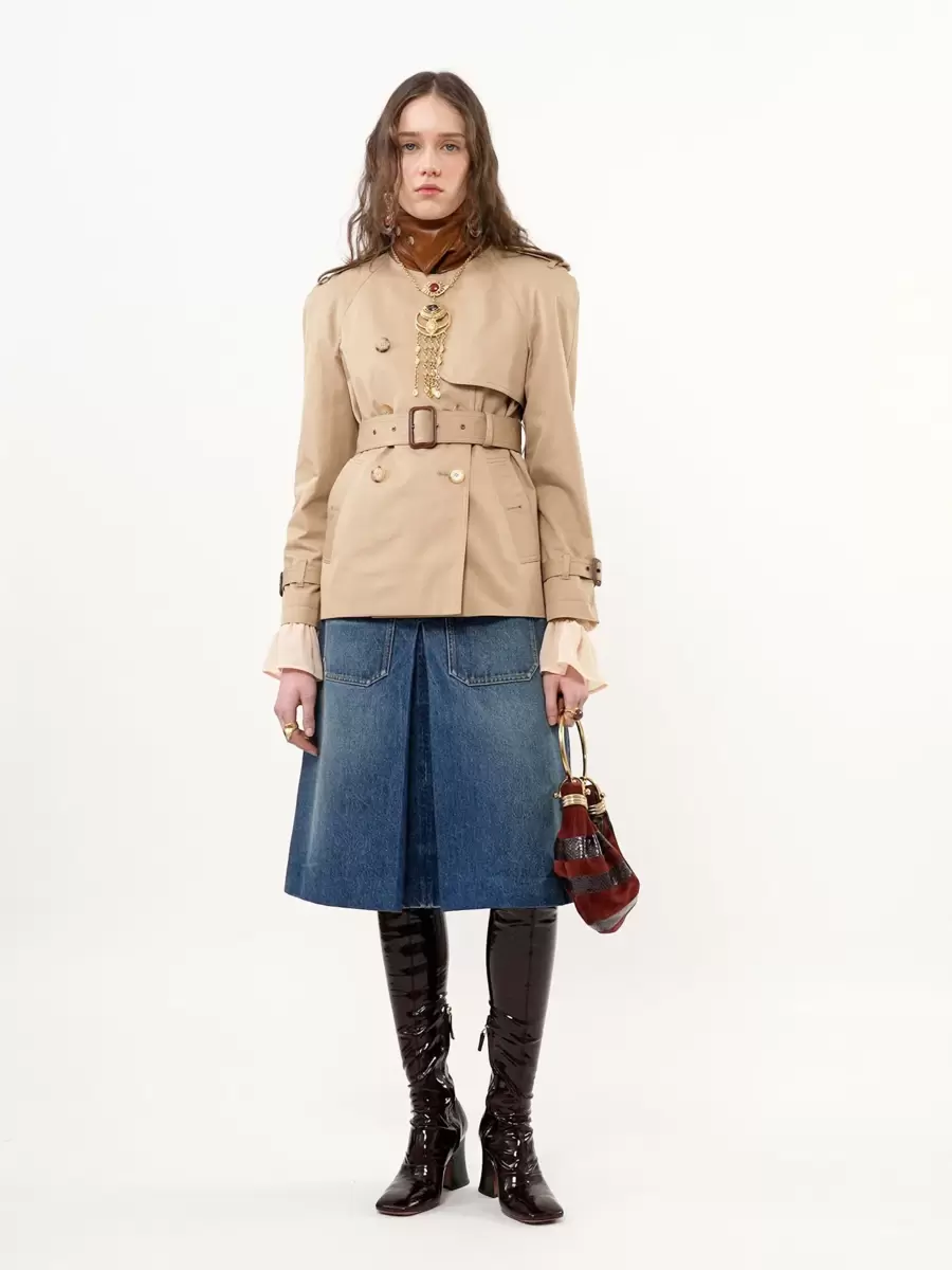 Short trench coat in cotton gabardine, featuring a lambskin-trimmed chin-strap collar, engraved horn buttons and a removable buckled belt. A storm flap, shoulder tabs and cuff tabs finish this piece.