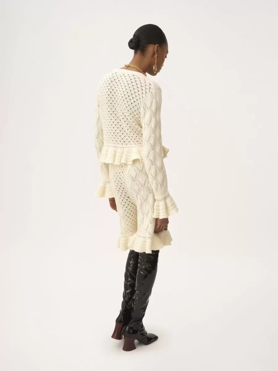 Crew-neck, cropped and ruffled cardigan in a silk, alpaca wool and cotton pointelle knit, featuring a flouncy hem and cuffs. Tonal Chloé logo embroidery and fabric-covered buttons at the front finish this piece.
