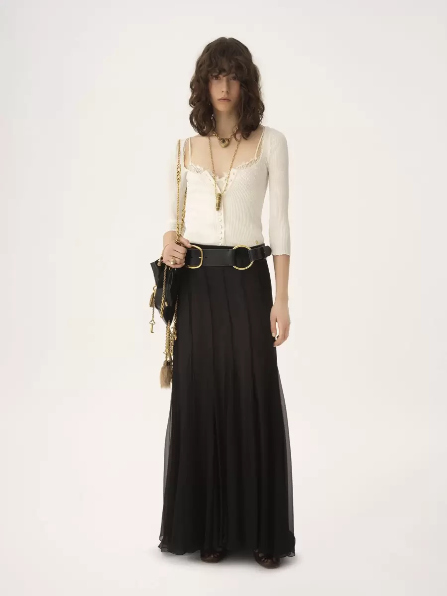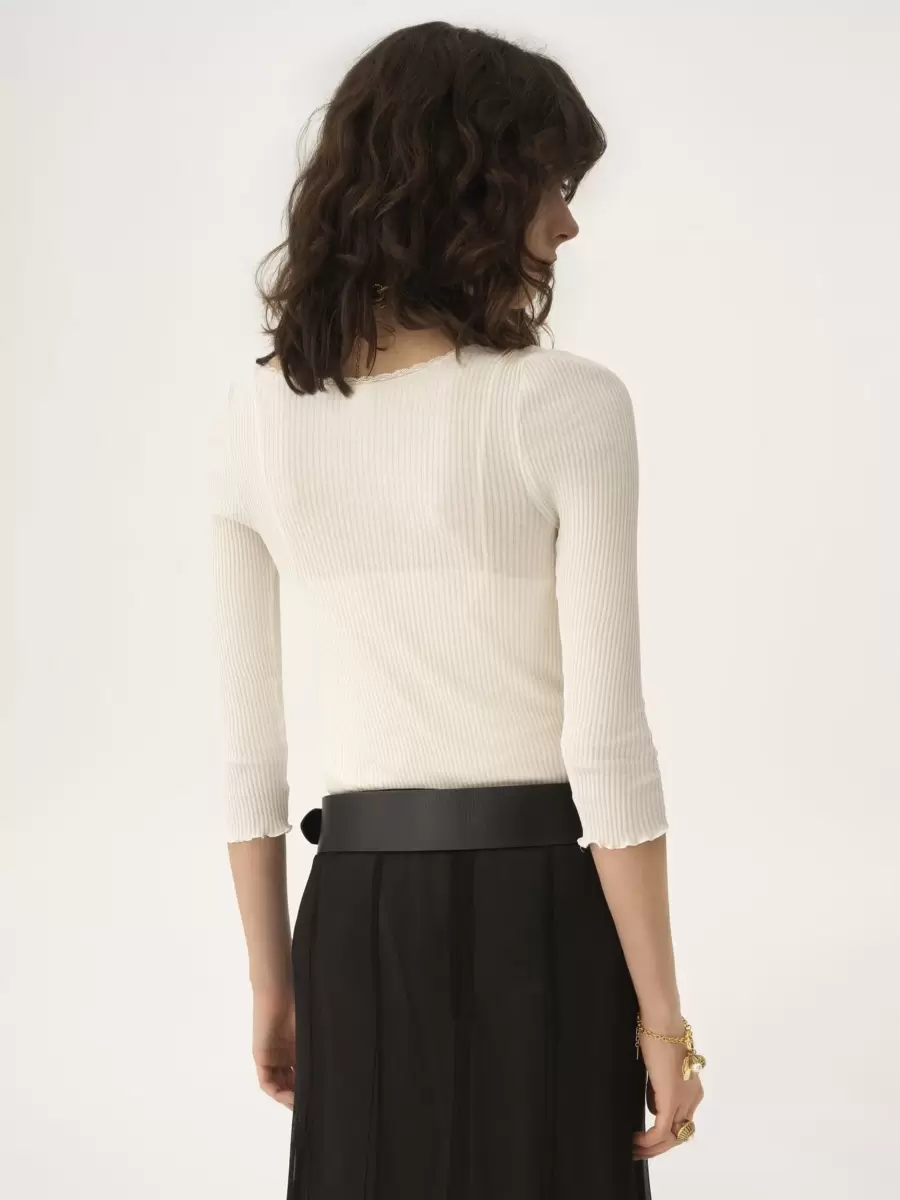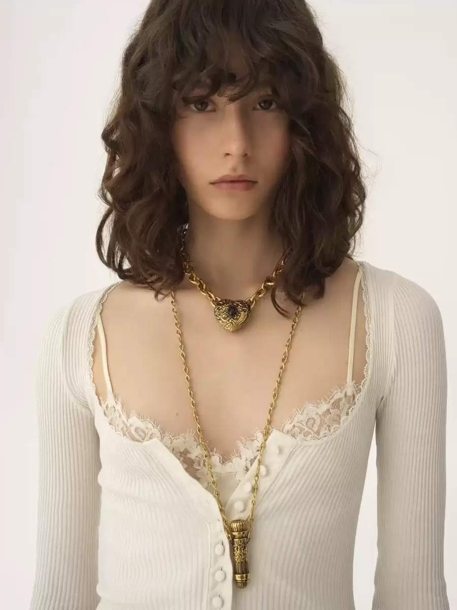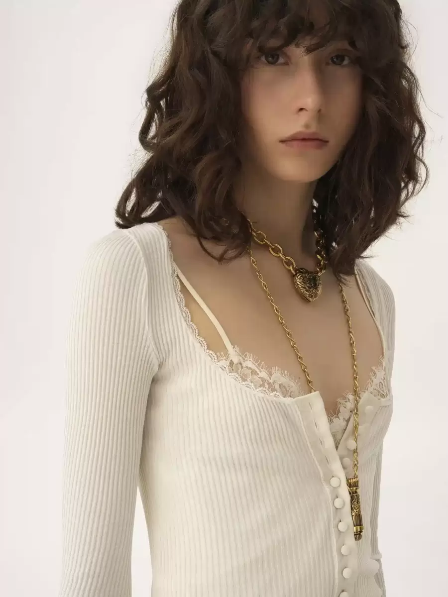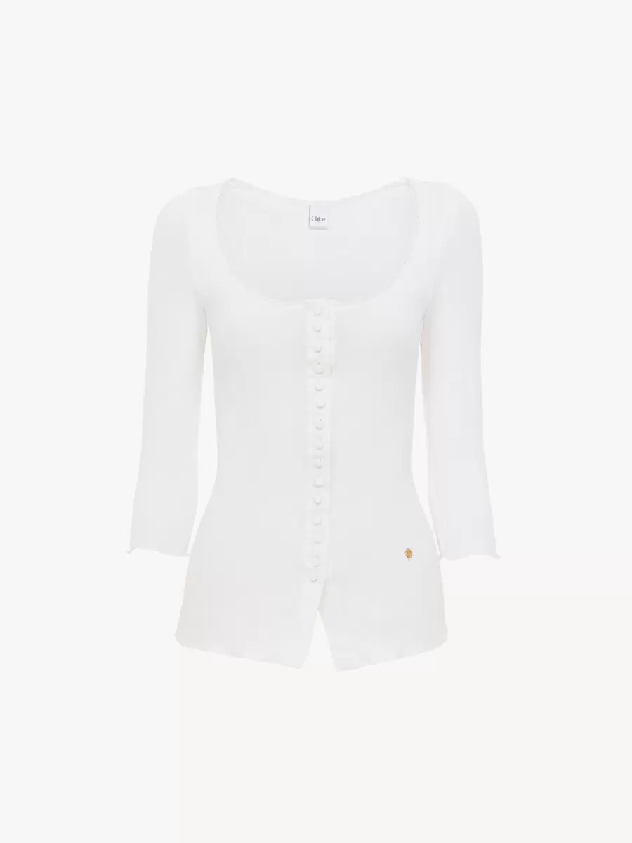 Scoop-neck fitted cardigan in tubular cotton with three-quarter sleeves, featuring a scalloped lace trim, fabric-covered buttons and a gold-tone medal at the hip.