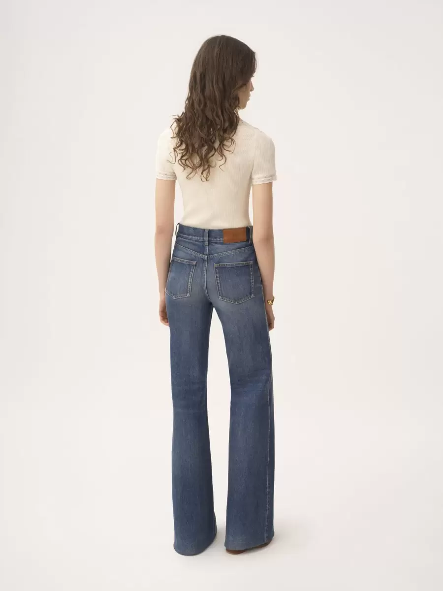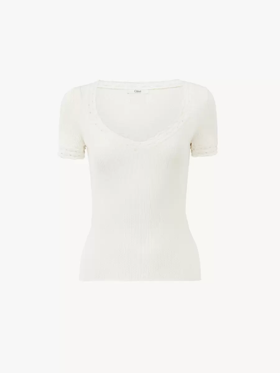 Scoop-neck fitted top in a lower-impact pointelle wool knit with lace trims and a subtle Chloé logo patch at the back.