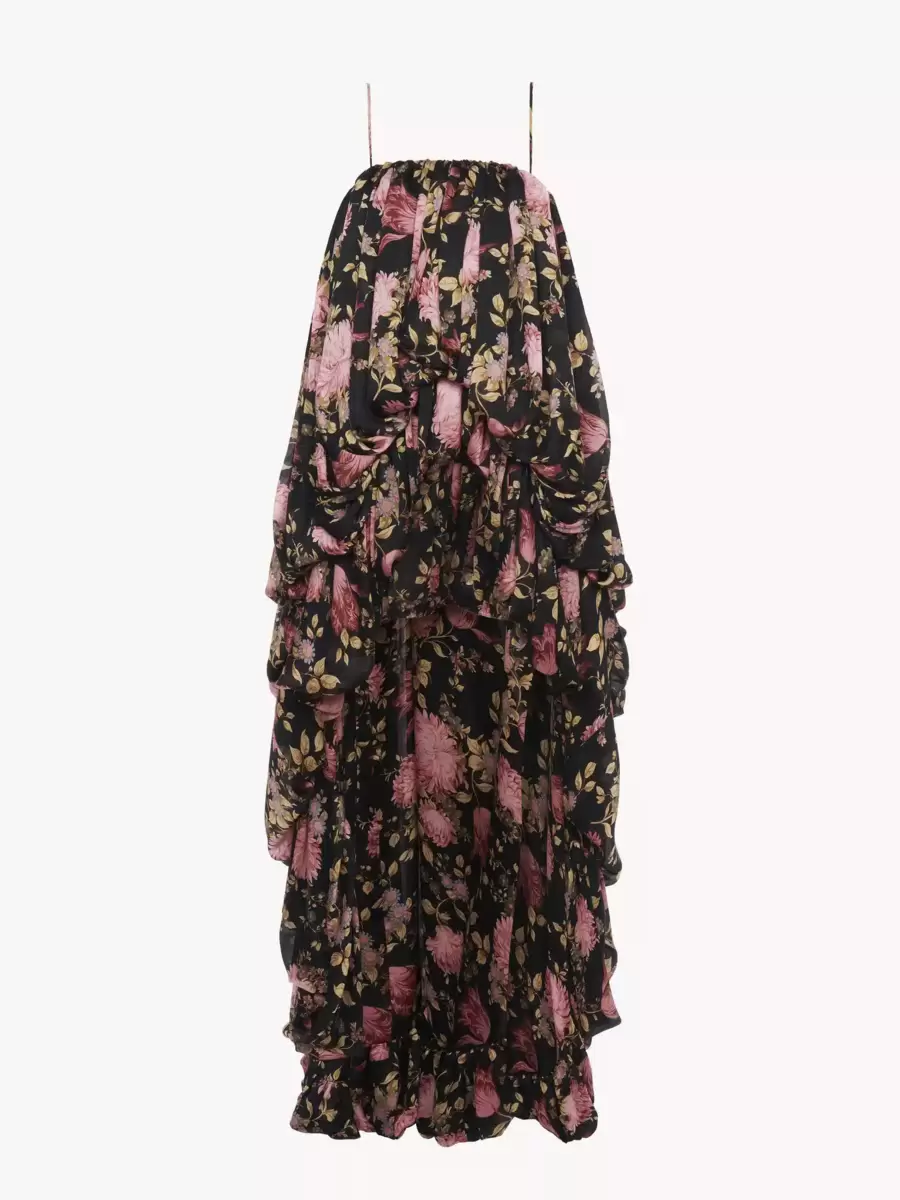 High-low sleeveless jumpsuit in organic silk charmeuse with an all-over floral print rooted in the Maison’s heritage. Thin straps finish the gathered, billowing silhouette.