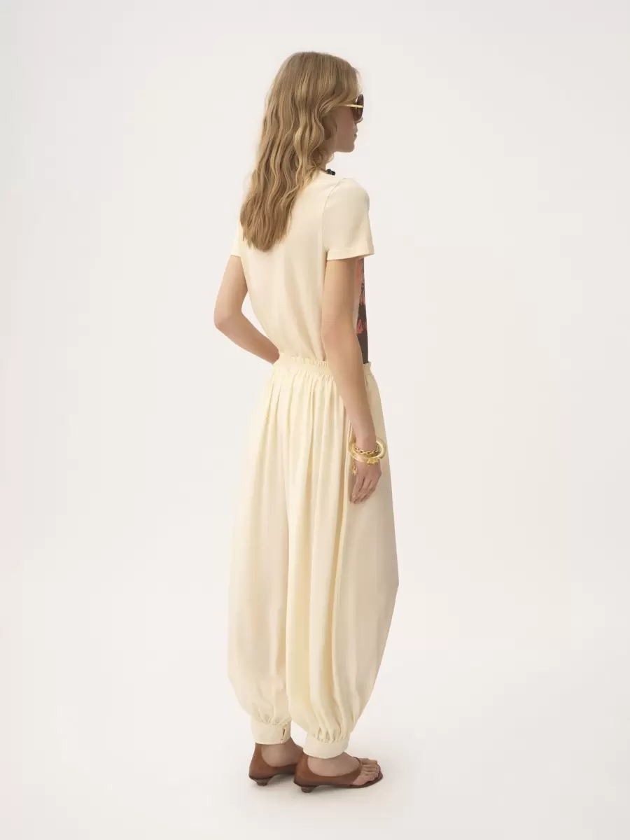Cropped fluid pants in organic silk crêpe de chine with a silk-mix separate shorts lining. The drawstring waist is detailed with gold-tone metal tips, while tonal embroidery and fabric-covered buttons embellish the hem.