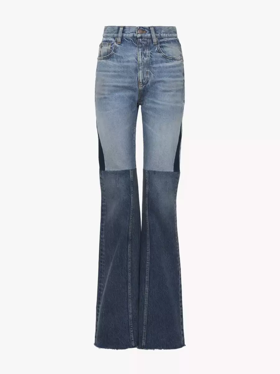 Tri-color flared patchwork jeans in waterless organic cotton denim with raw hem edges.