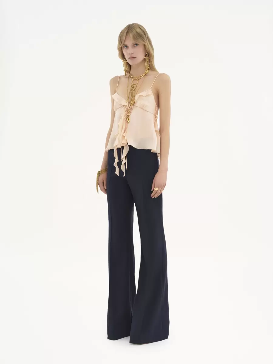 Flared tailored pants in lower-impact iconic stretch wool, finished with pressed front creases.