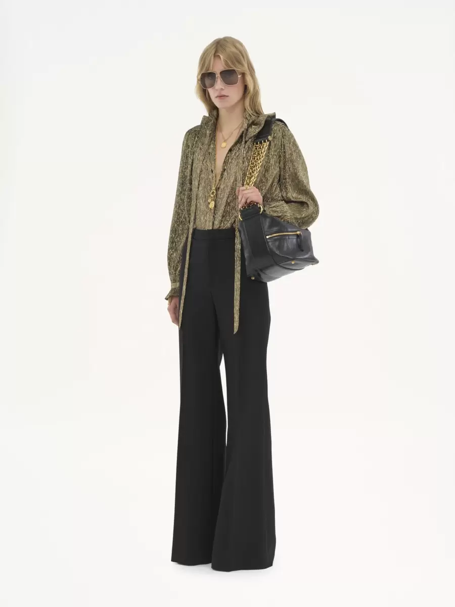 Flared tailored pants in lower-impact wool grain de poudre with pressed creases.