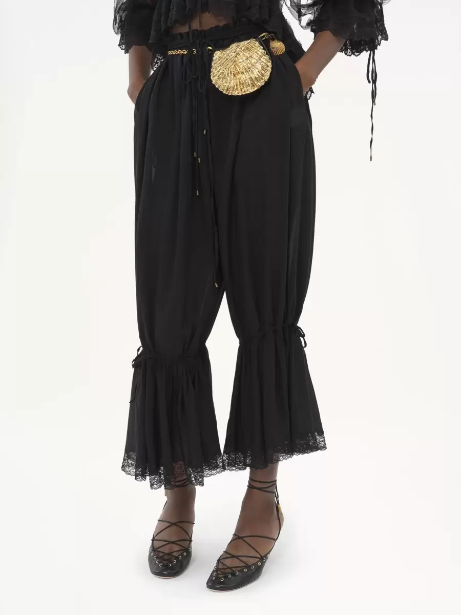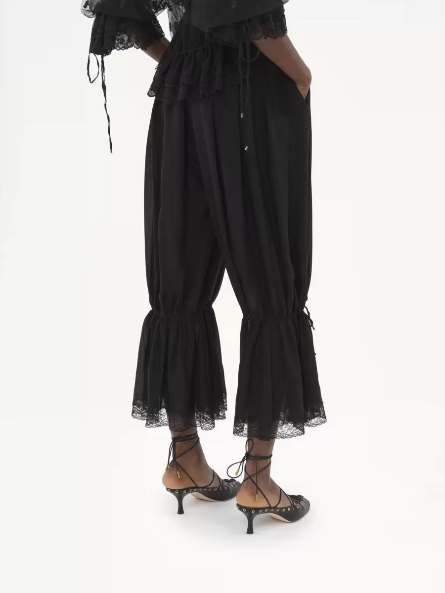 Fluid cropped pants in light organic silk charmeuse with a separate shorts lining. Cinched below the knees by tie fastenings, the pants feature a lace trim at the hem and a drawstring waist detailed with gold-tone metal tips.
