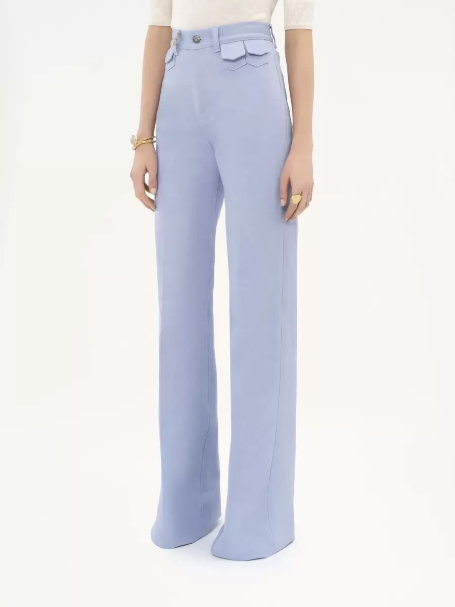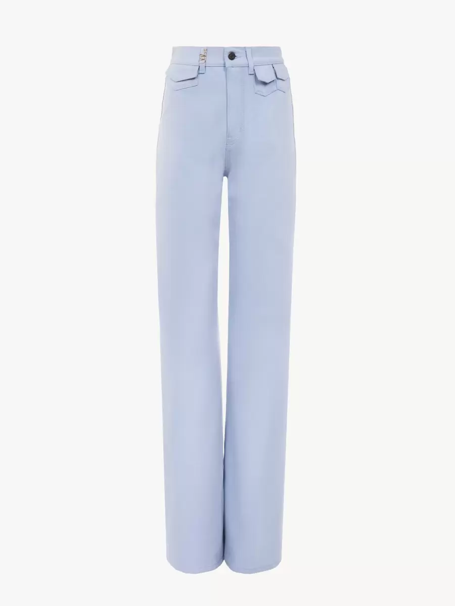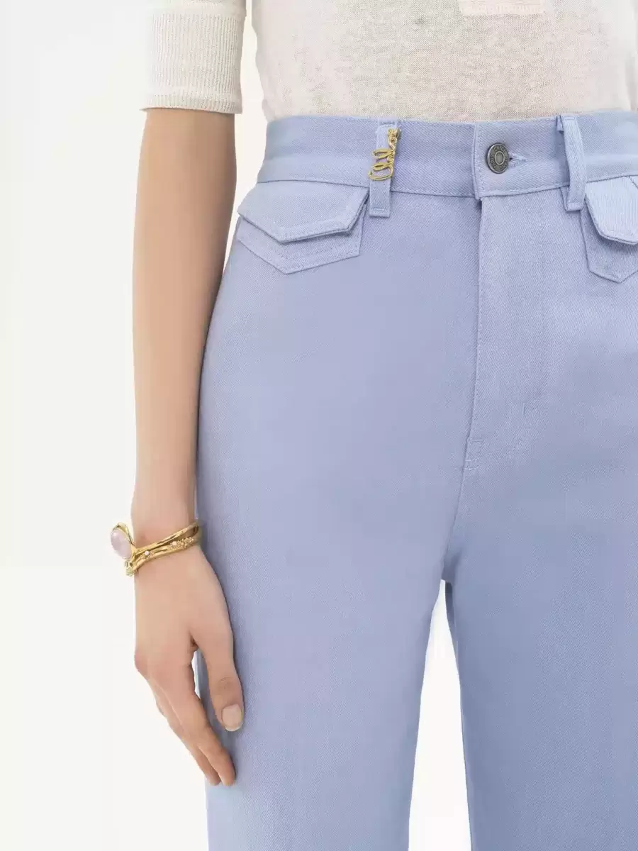 High-rise flare jeans in piece-dyed organic cotton denim with mini flap pockets at the waist.
