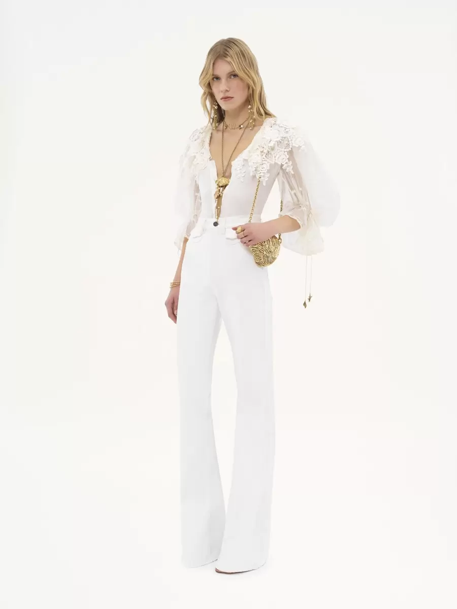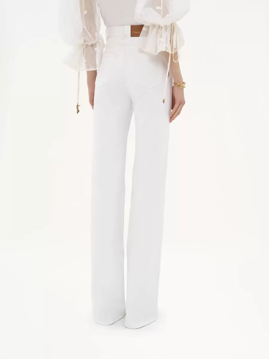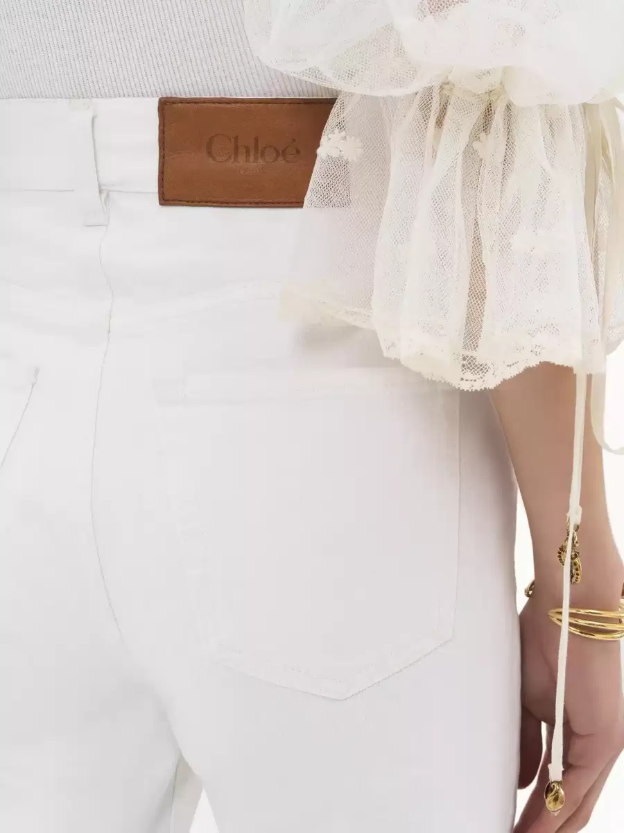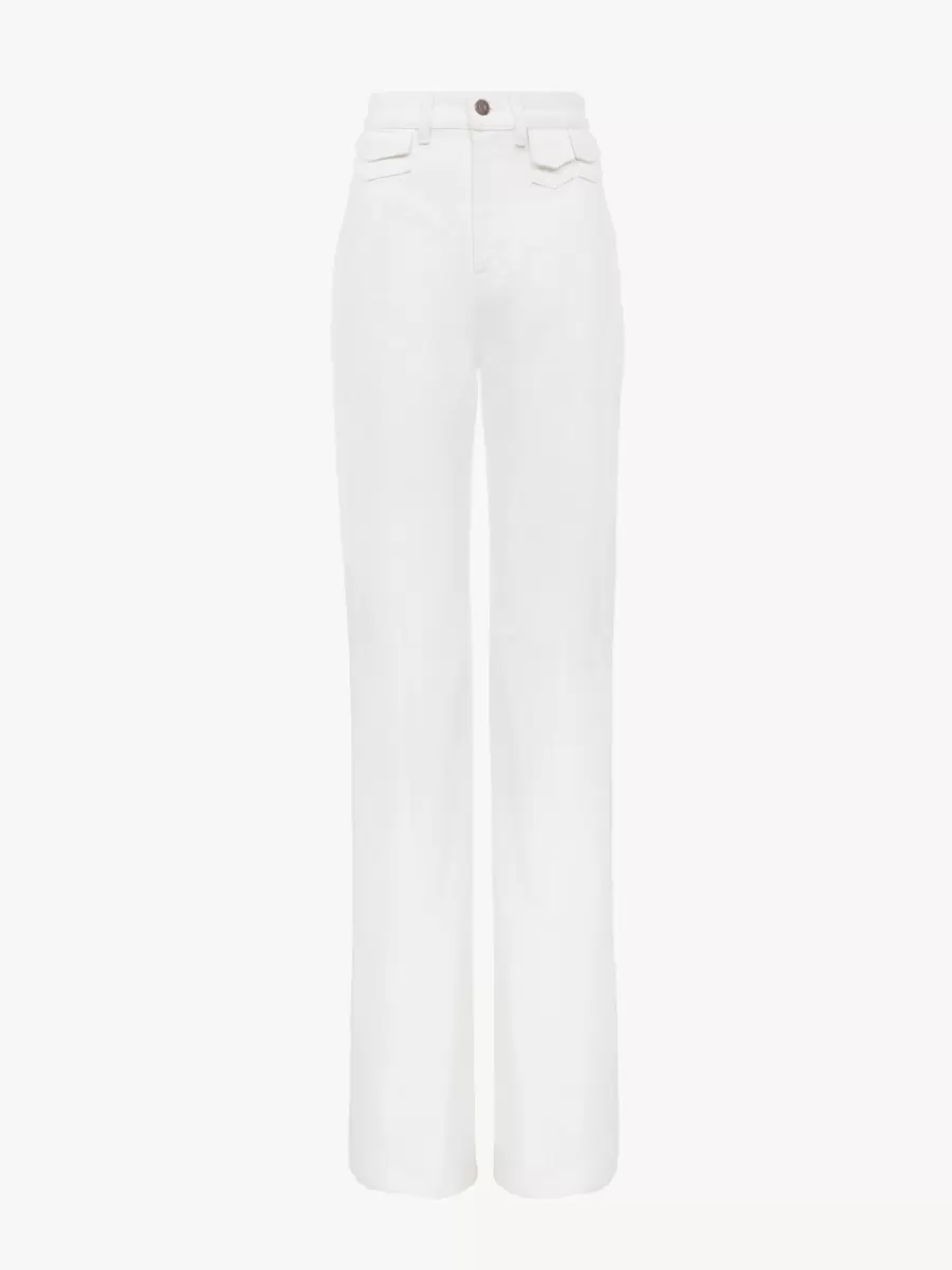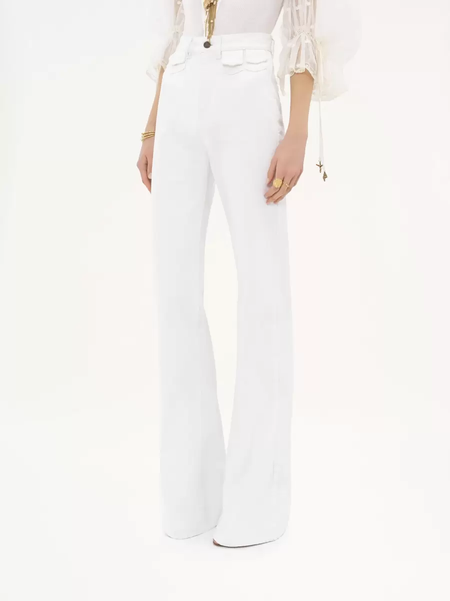 High-rise flare jeans in organic cotton denim with mini flap pockets at the waist.
