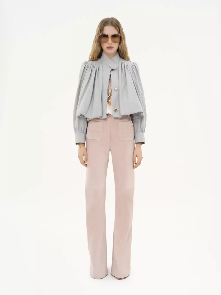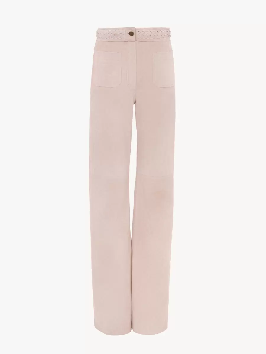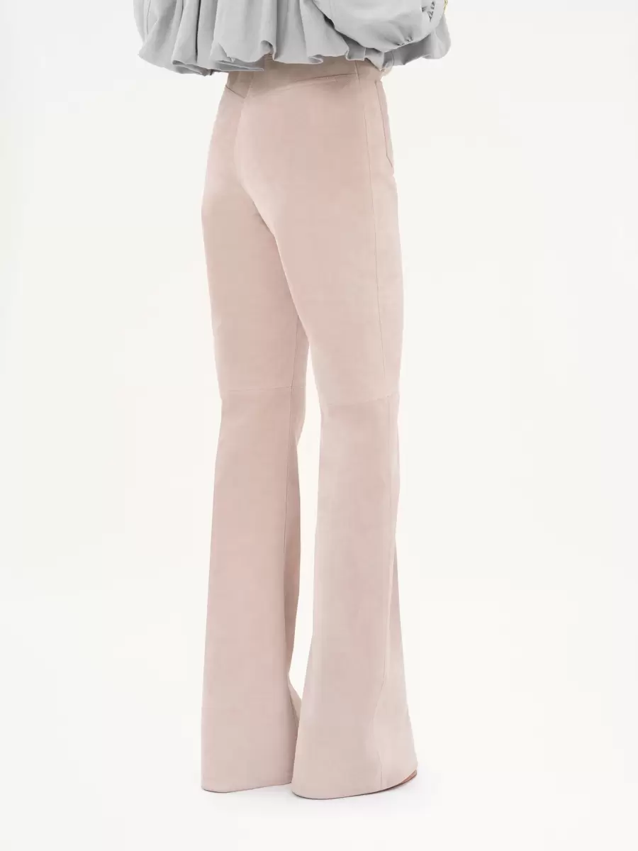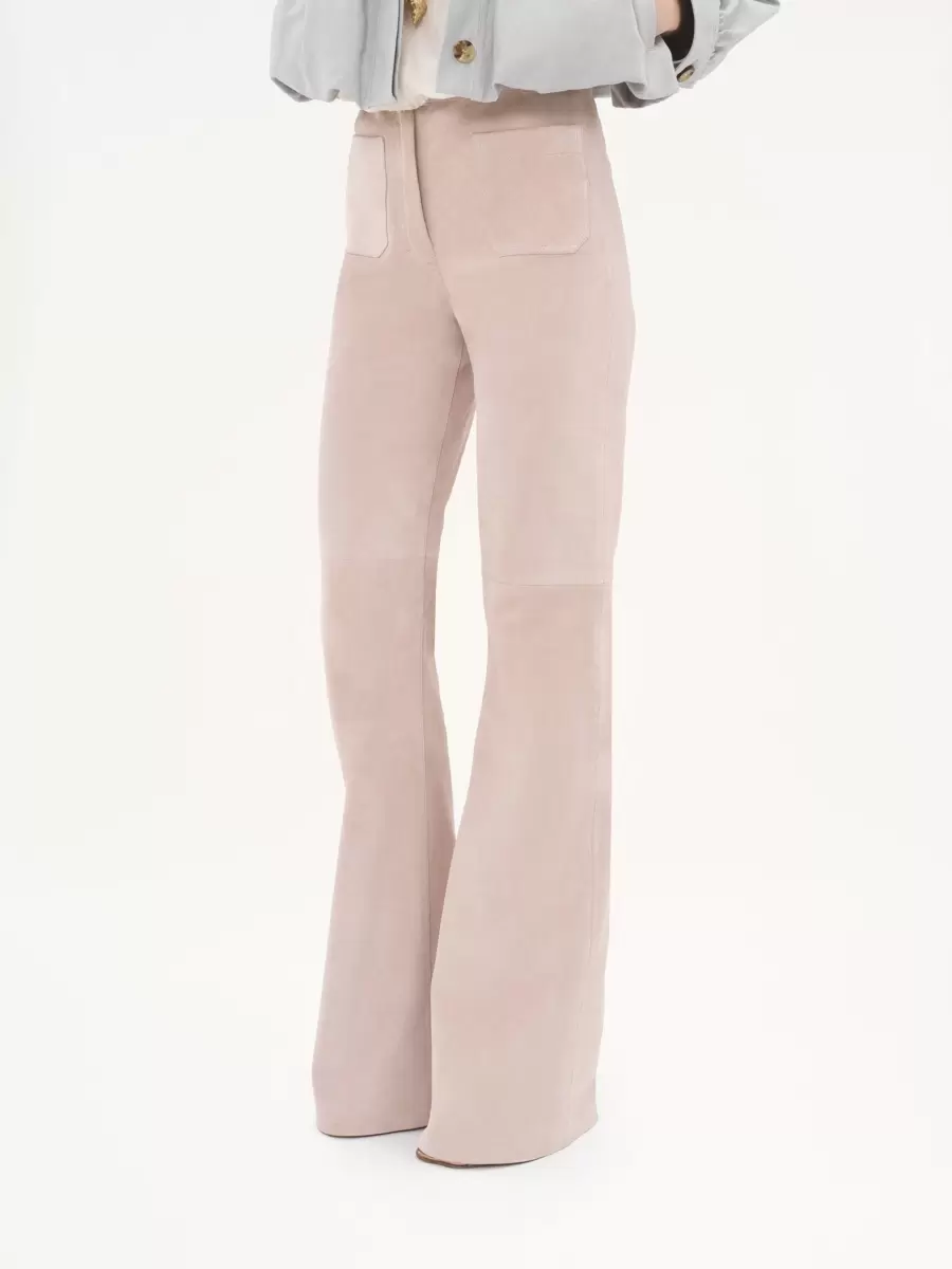 High-rise flared pants in soft suede nappa leather, featuring patch pockets and a braided trim around the waist.