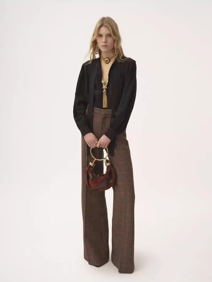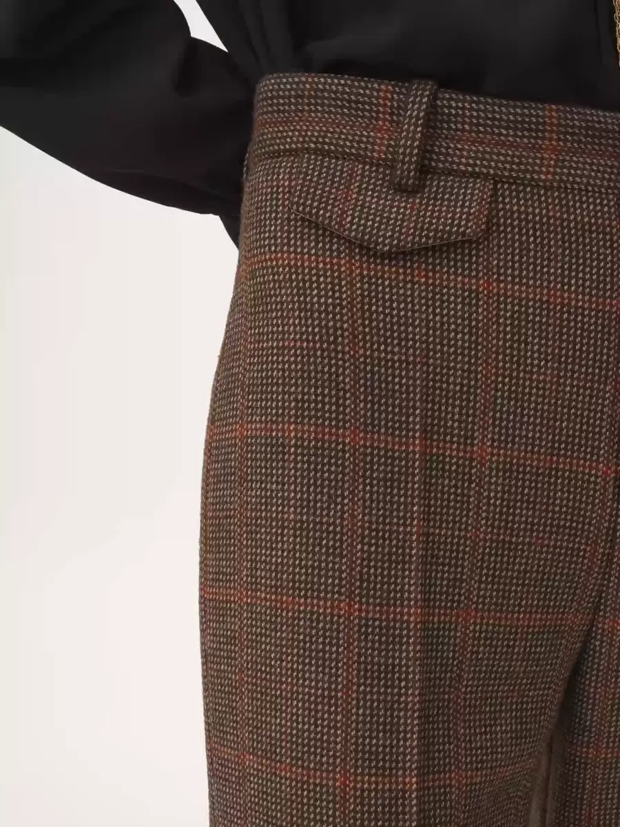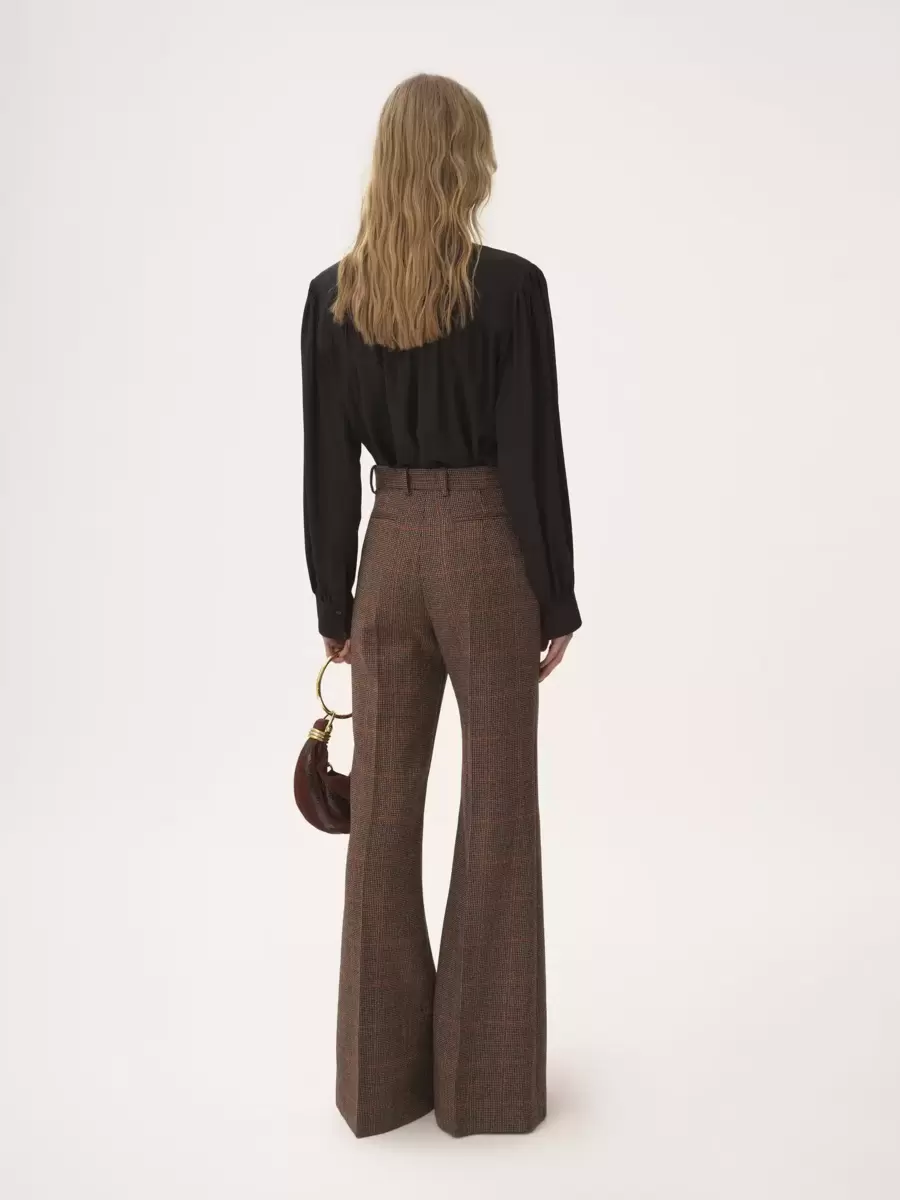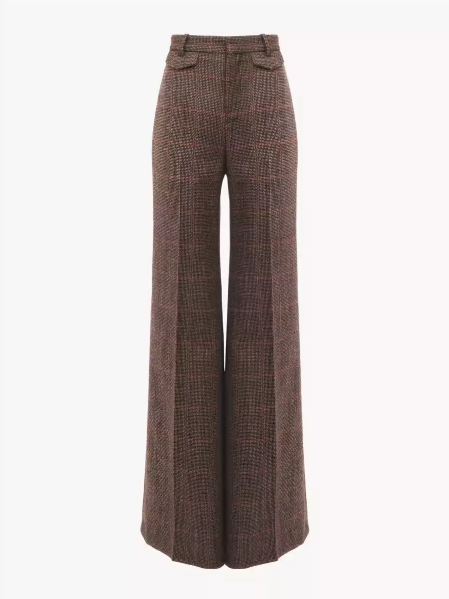 High-rise flared pants in lower-impact wool check, detailed with a mini flap pocket at the hip.