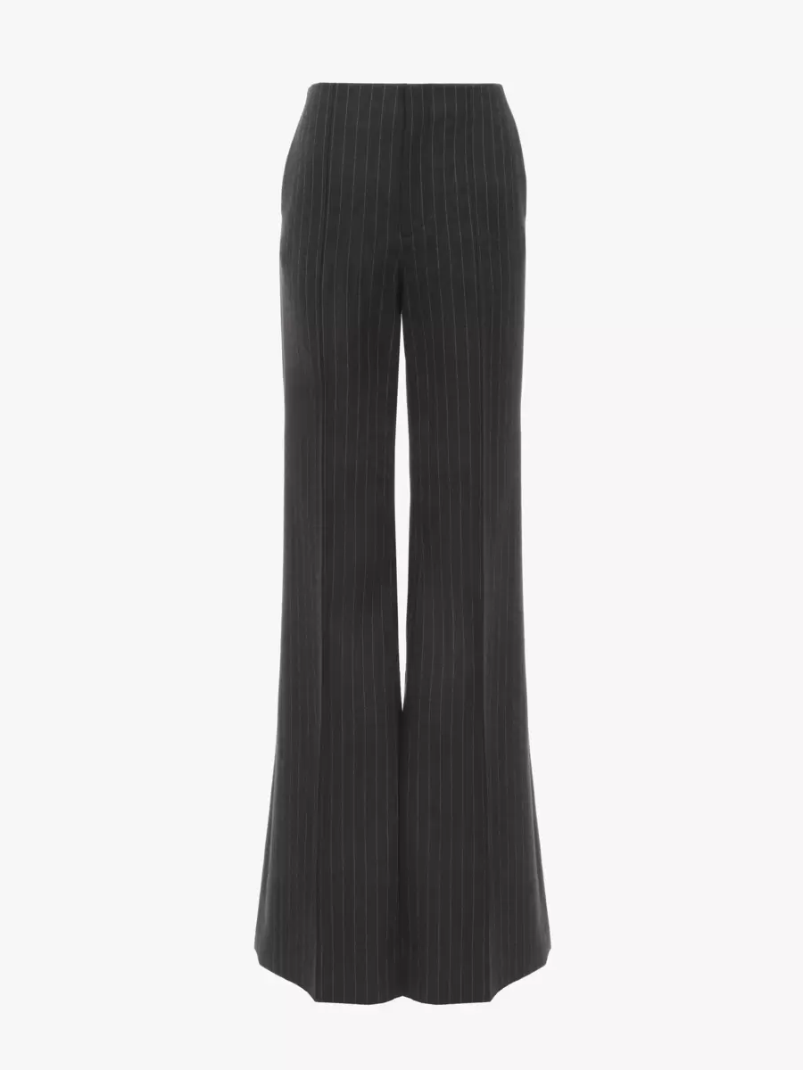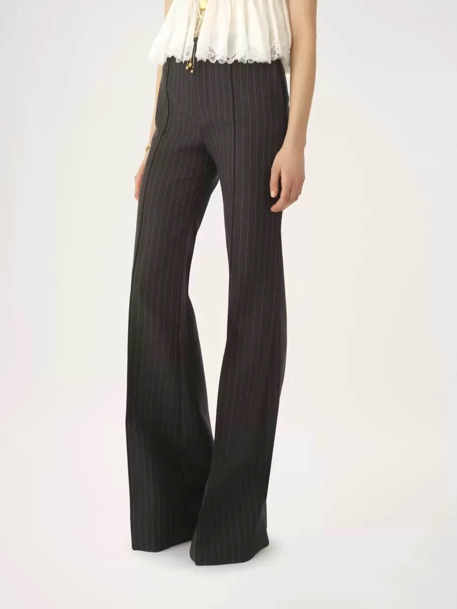 Tailored bootcut pants in pinstripe wool, featuring raised seams and no waistband.