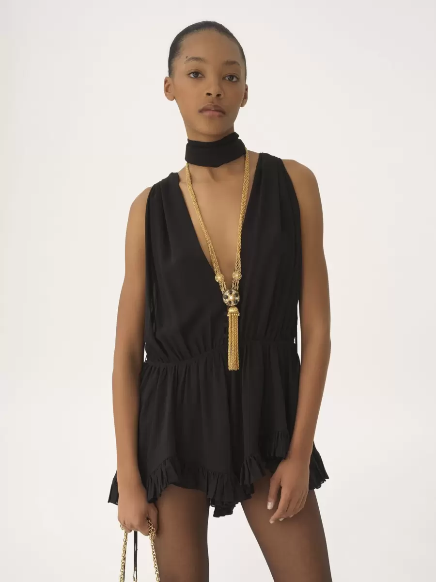 Deep V-neck ruffled jumpsuit in organic silk georgette with a scarf tied at the back. Ruffle trims detail the hem, while the drawstring waist features dangling ties finished with gold-tone metal tips.