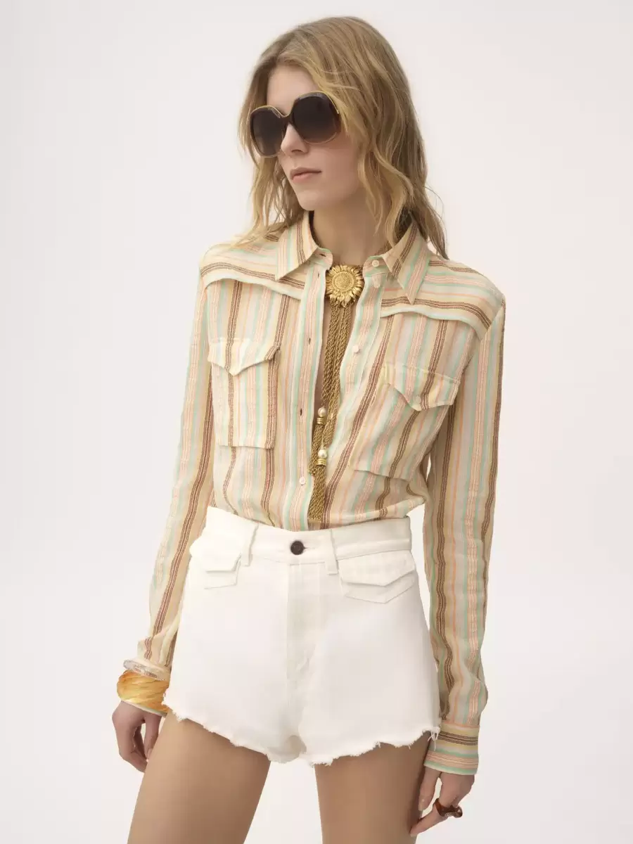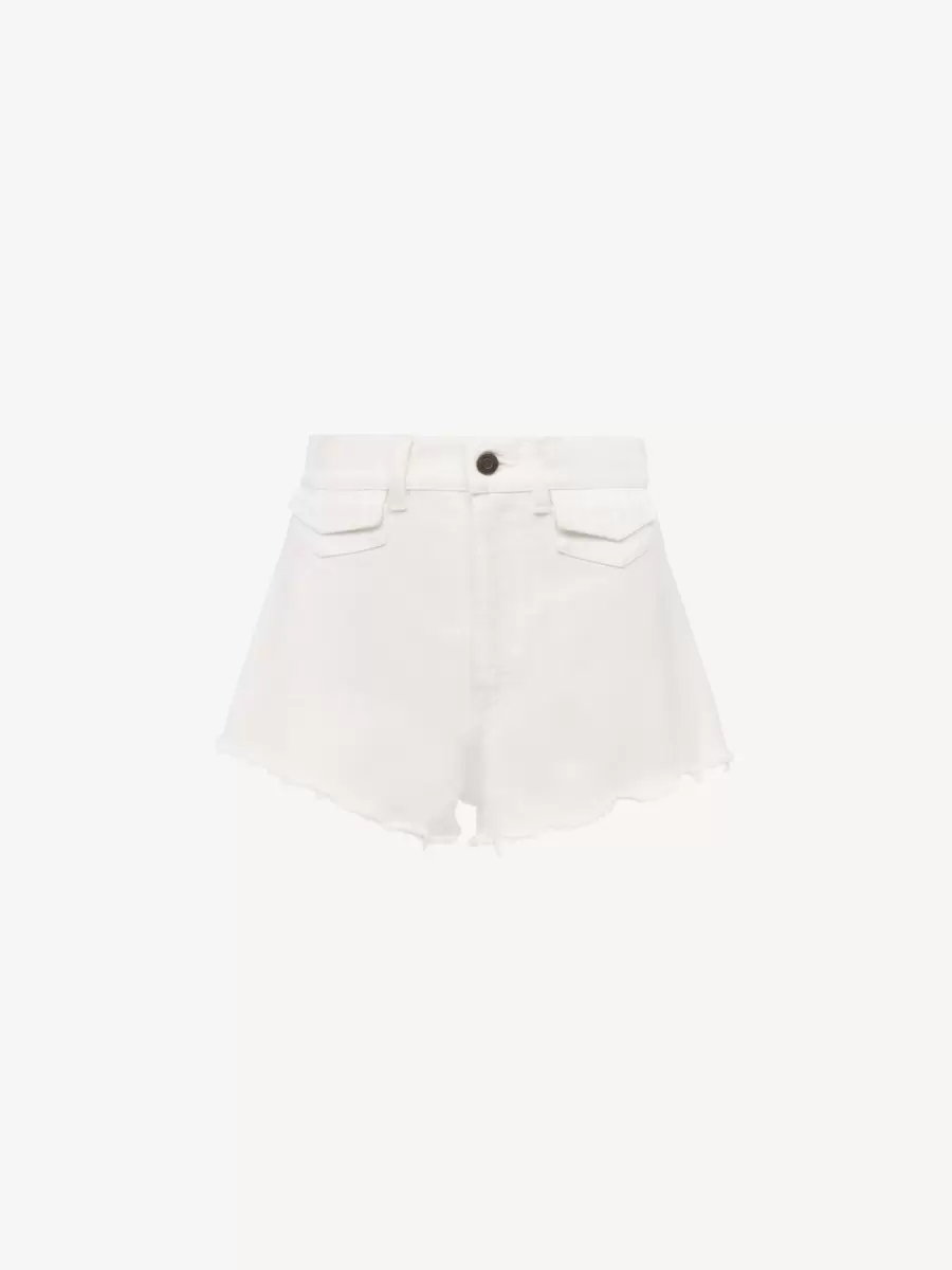 High-rise mini shorts in organic cotton denim with mini flap pockets and frayed trims. A leather Chloé Paris logo patch signs the back.