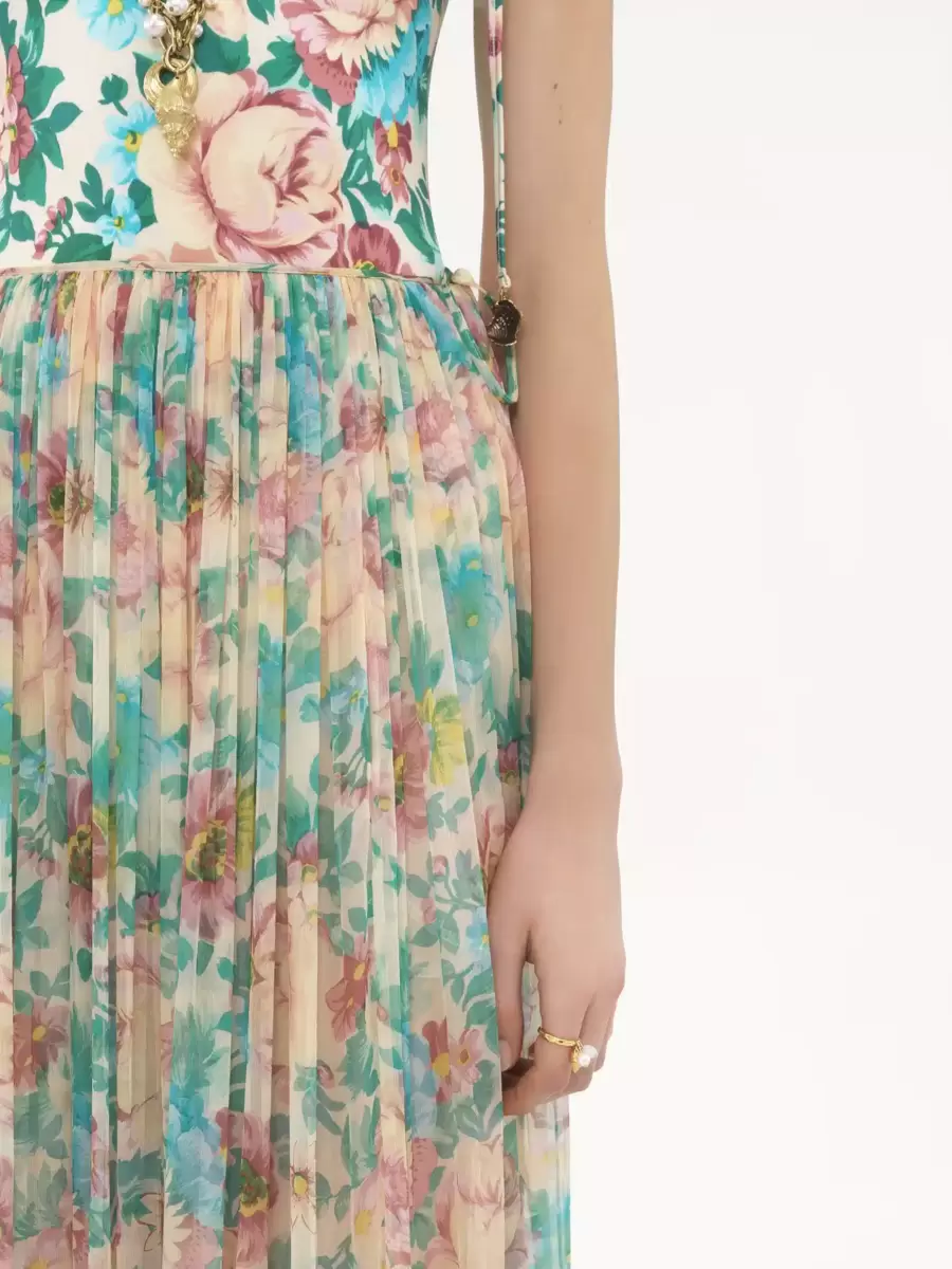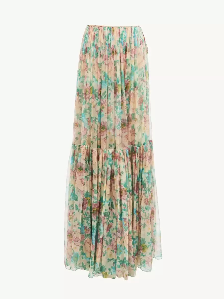 Gathered maxi skirt in organic silk mousseline with a floral print inspired by the Maison’s heritage. The fluid, tiered silhouette includes a silk-mix lining, while a dangling side tie with hammered metal tips finishes this piece.